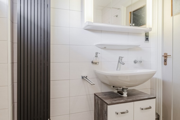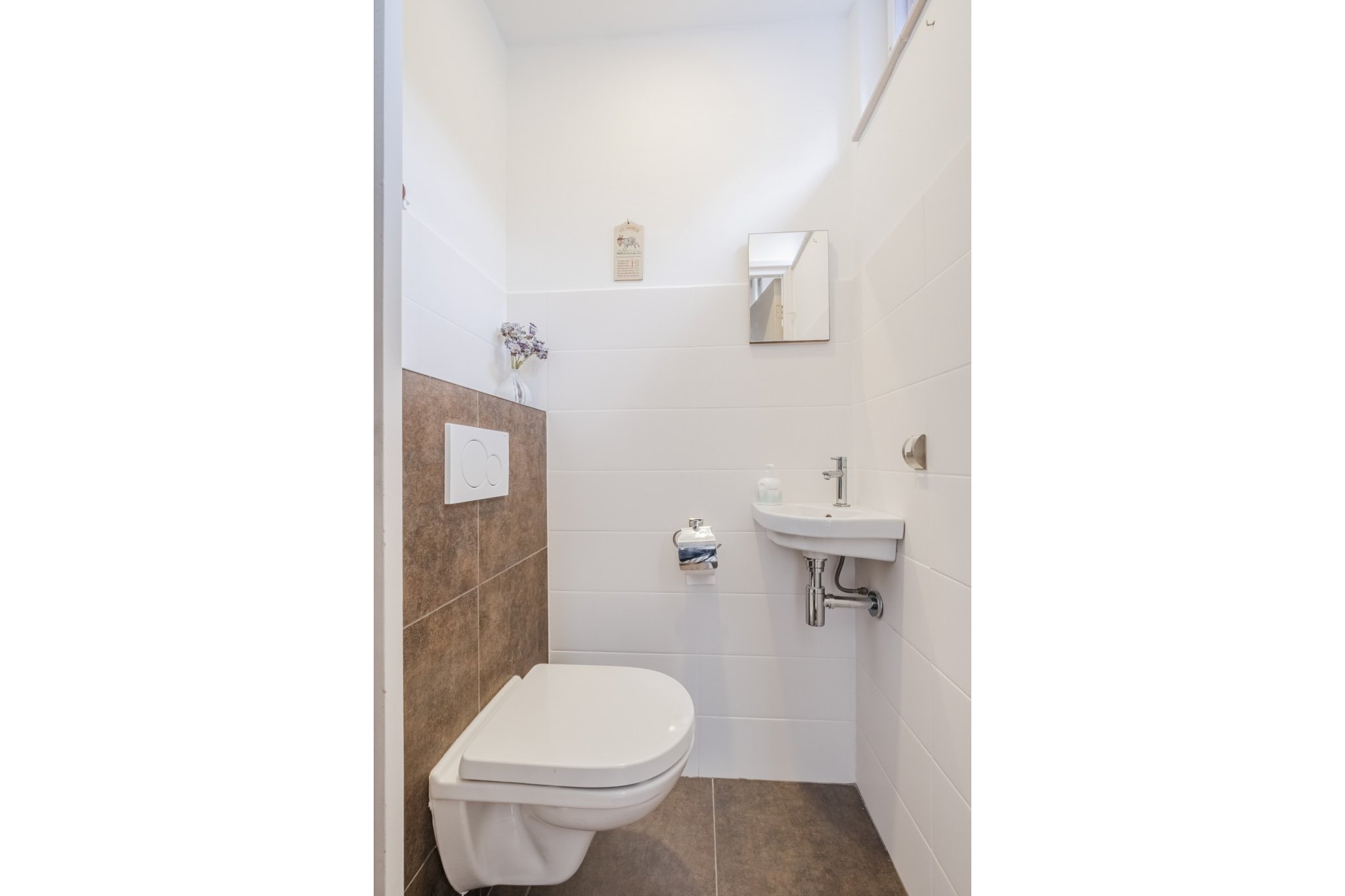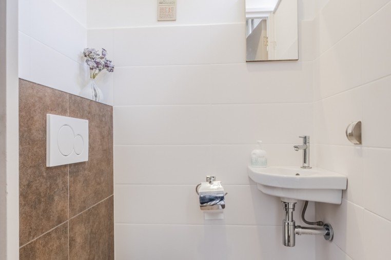 Moderne, in 2022 vernieuwde, deels betegelde toiletruimte met wandcloset, designradiator en fonteintje.