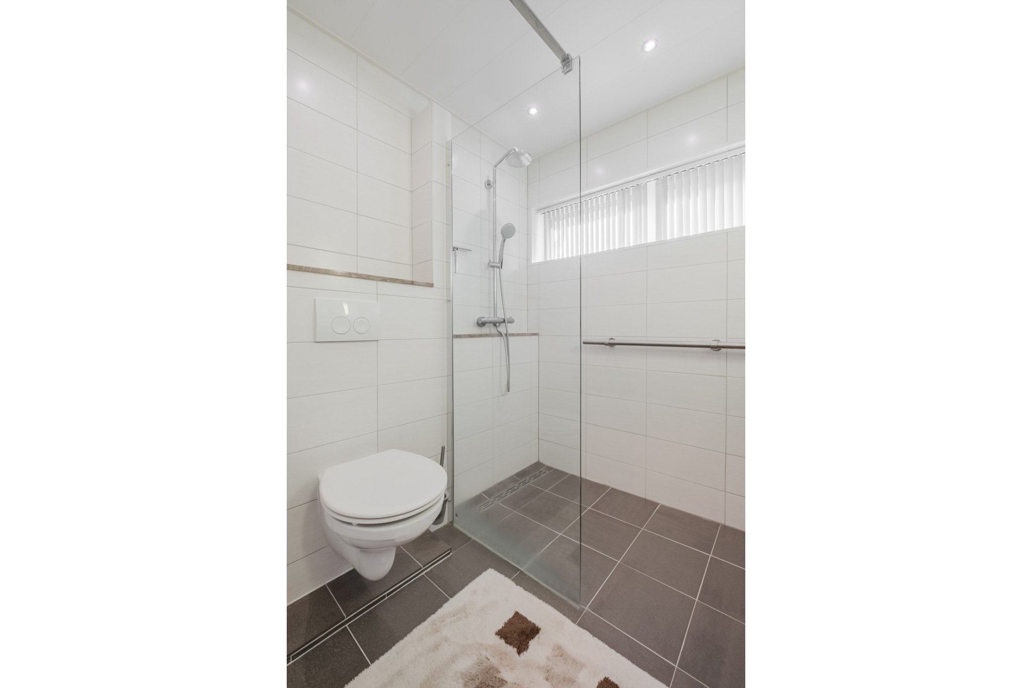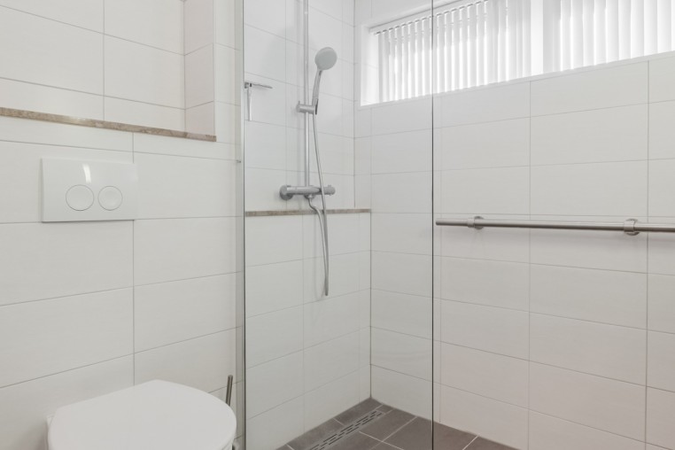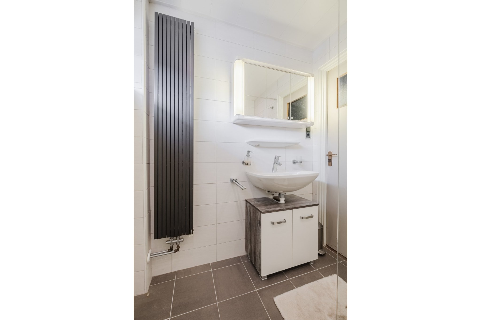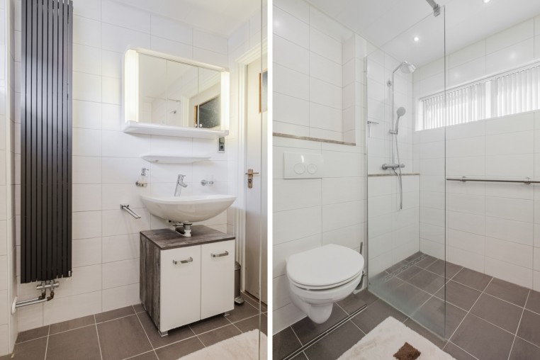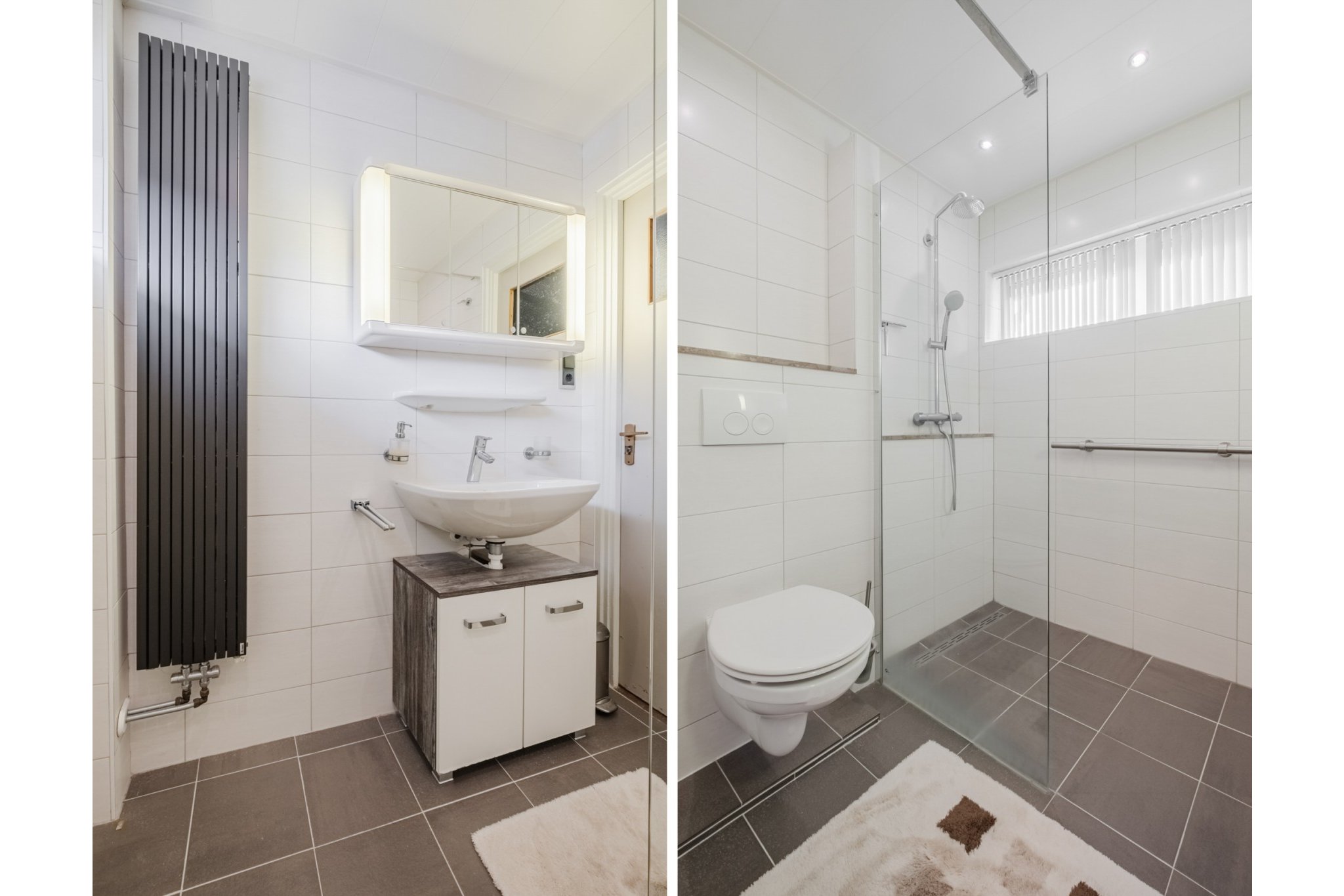 Moderne, in 2021 vernieuwde, tot plafond betegelde badkamer met ruime inloopdouche, vaste wastafel, wandcloset en grote designradiator.