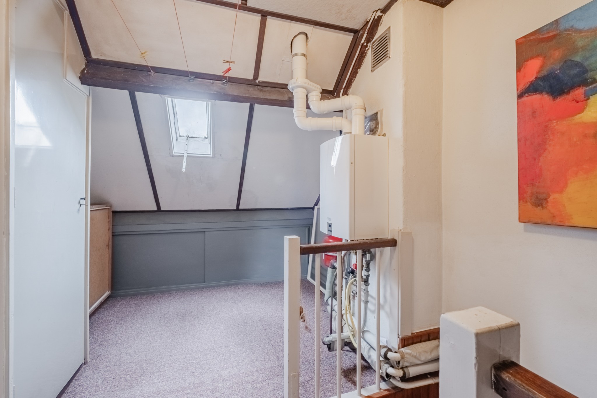 Overloop met vloerbedekking, opstelling c.v.-ketel (Remeha Avanta 28C, 2020), aansluiting wasmachine, dakraam en bergruimte.