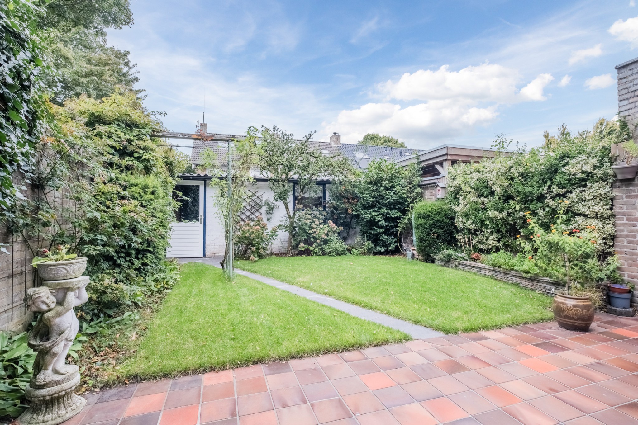 * Zonnige achtertuin met vast terras.