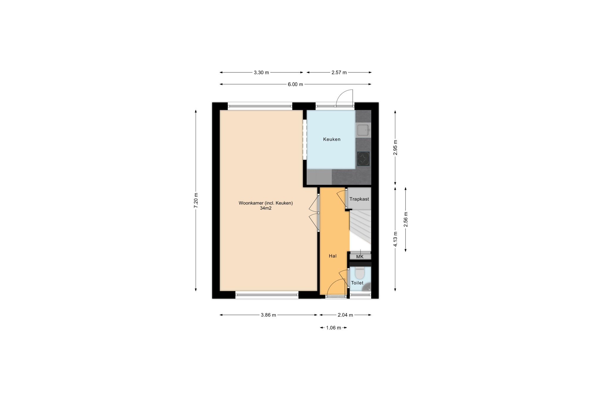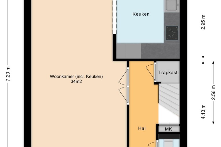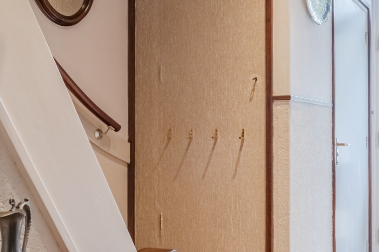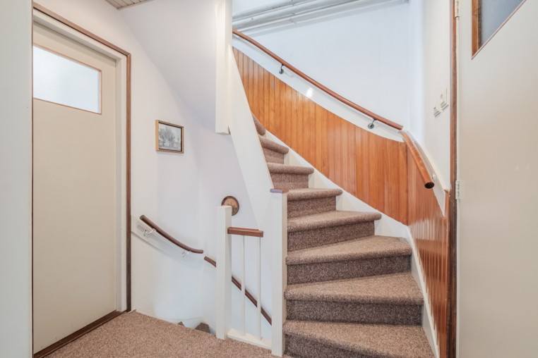 Entree; hal met kurk laminaat, meterkast (met 3-fase aansluiting), praktische trapkast en trapopgang naar de 1e verdieping.