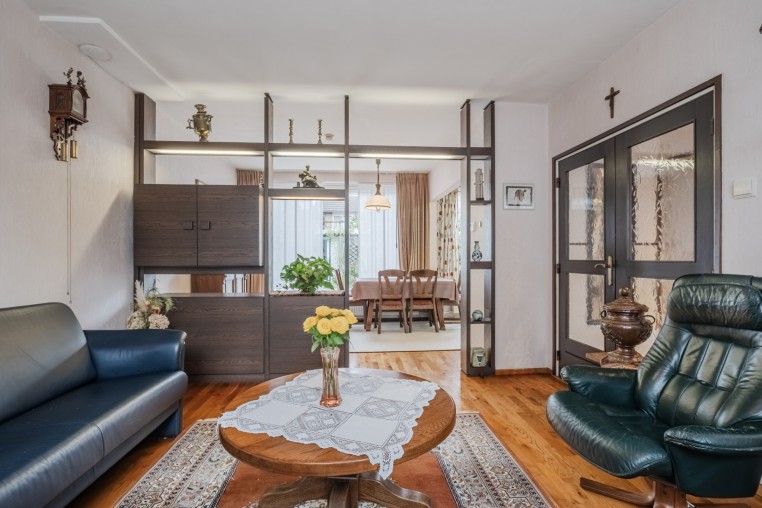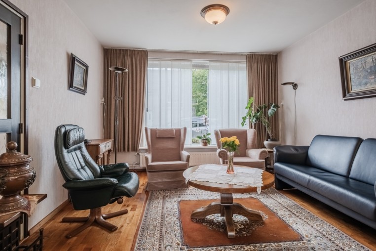 Sfeervolle woonkamer, ± 34 m² (incl. keuken) met houtparketvloer en veel lichtinval door de grote raampartijen. De achterzijde van de woonkamer is voorzien van een elektrische zonneluifel en de voorzijde van een handmatige screen.