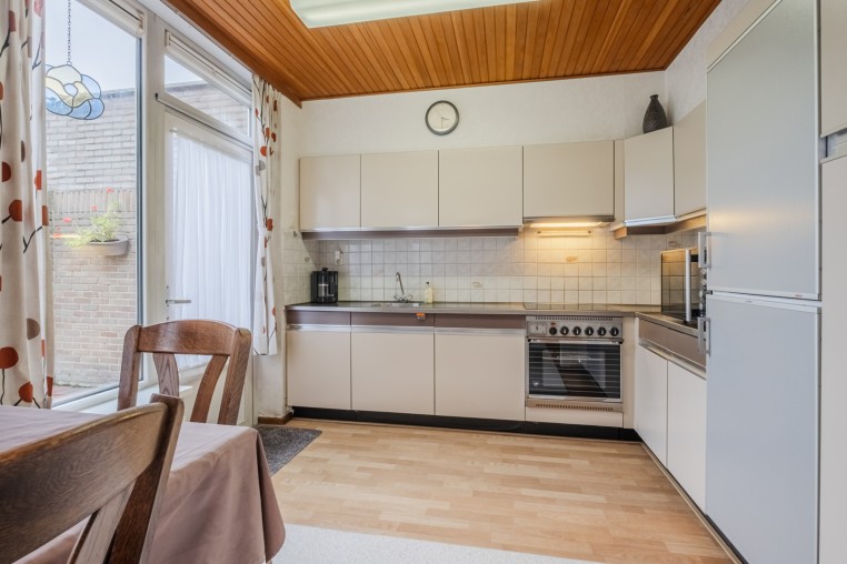 Open keuken met kunststof pui en achterdeur voorzien van laminaatvloer in hoekopstelling met diverse onder- en bovenkasten en inbouwapparatuur, t.w.: inductiekookplaat, afzuigkap, koelkast, vriezer en vaatwasser.