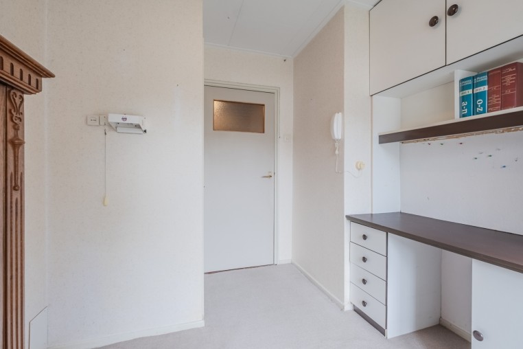 Slaapkamer 3, ± 7 m², met vloerbedekking, inbouwkast en een op maat gemaakte bureau-wandkast.