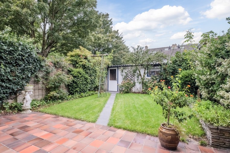 Zonnige achtertuin op Westen gelegen met groot terras, gazon en plantenborders met volwassen beplanting.