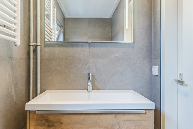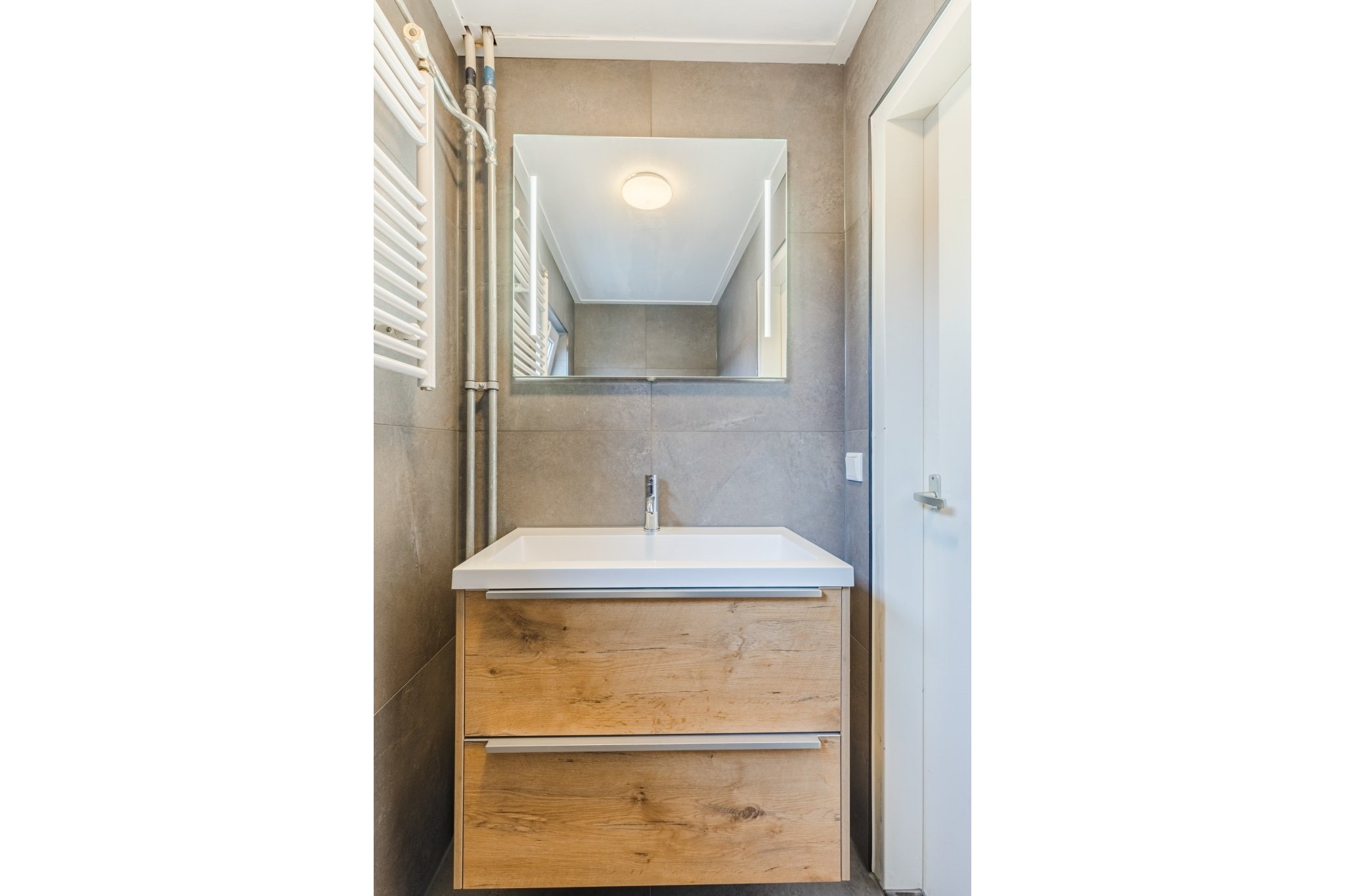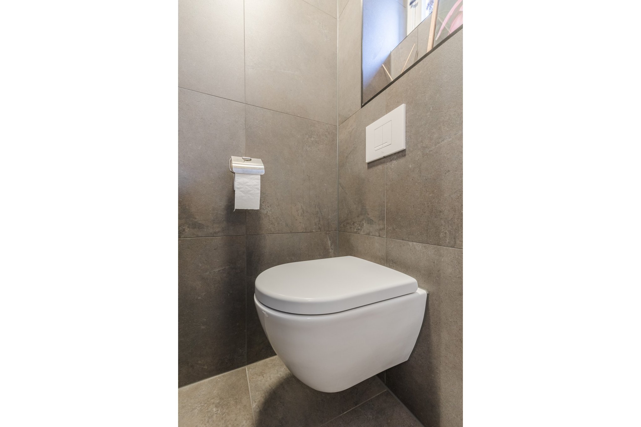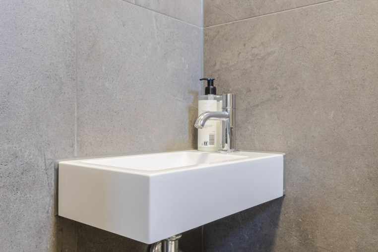 Luxe en moderne, geheel betegelde toiletruimte (voorheen badkamer) met hangend toilet, fonteintje en designradiator.