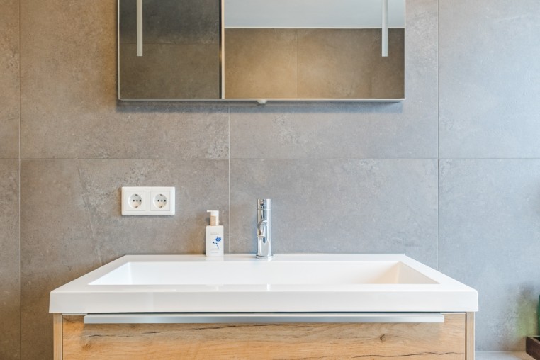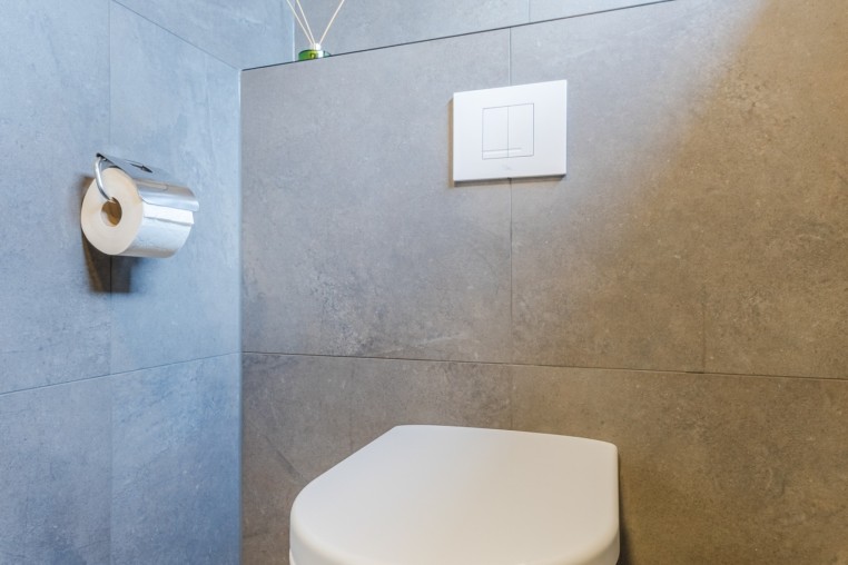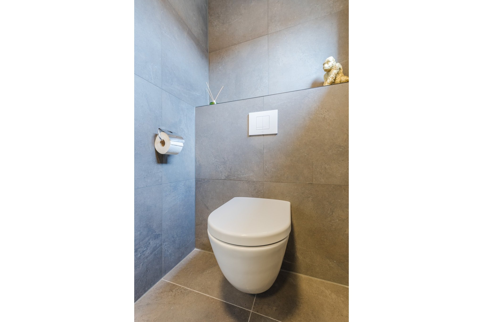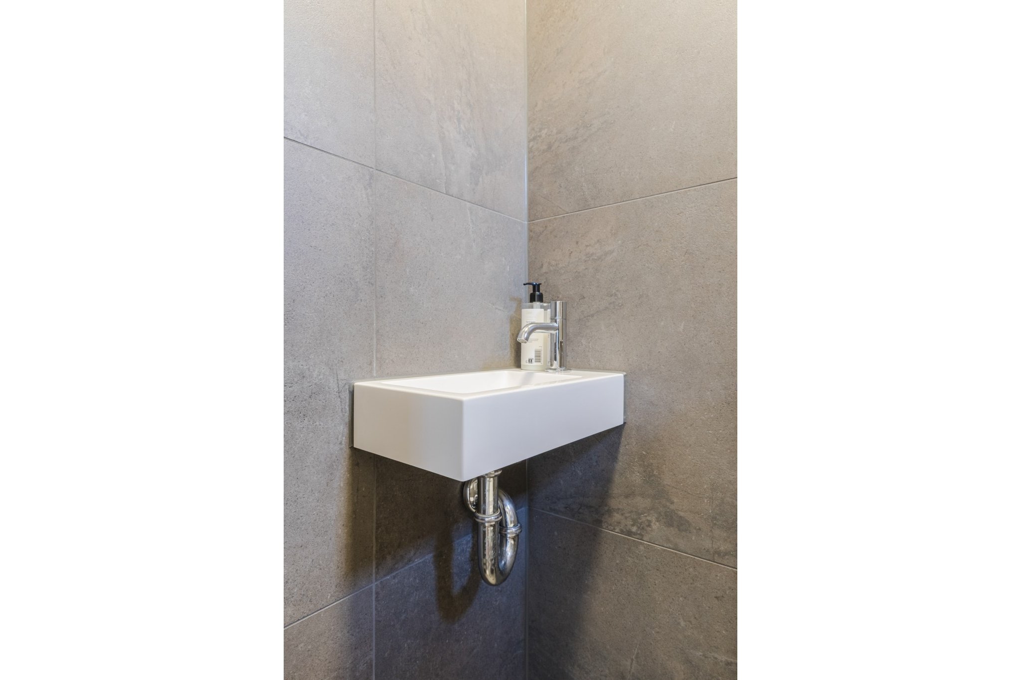 Luxe en moderne, geheel betegelde toiletruimte met hangend toilet en fonteintje.