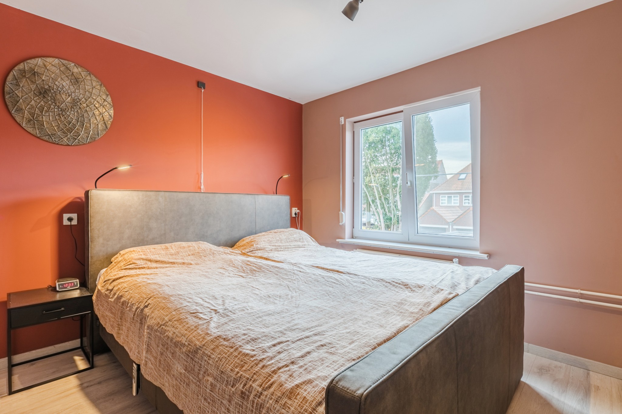 Slaapkamer, ± 10 m², met laminaatvloer en handmatig bedienbaar rolluik.