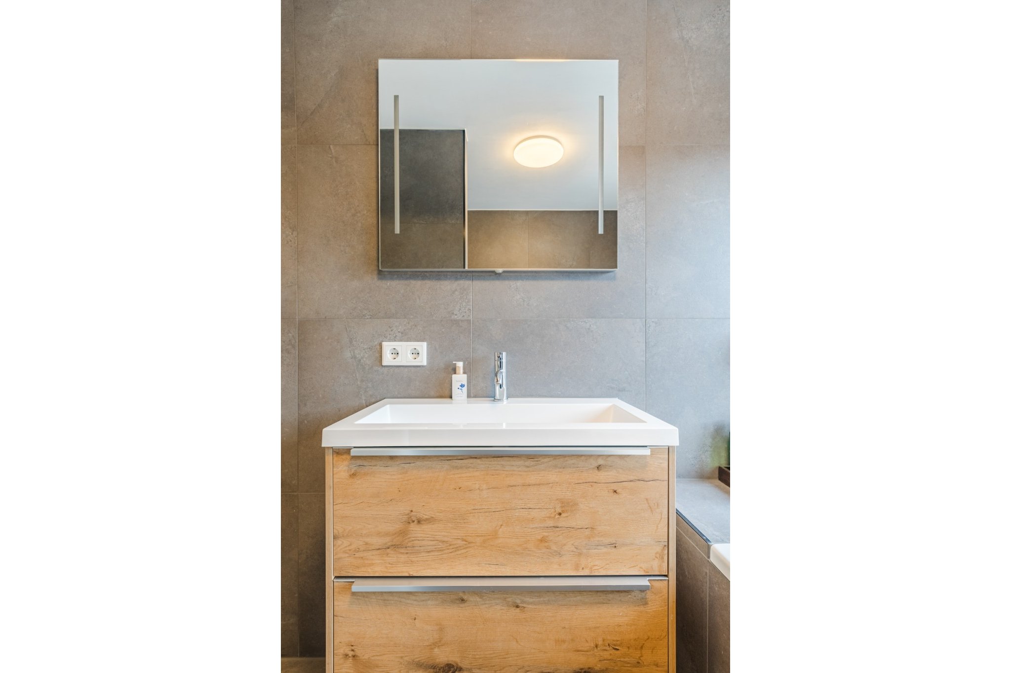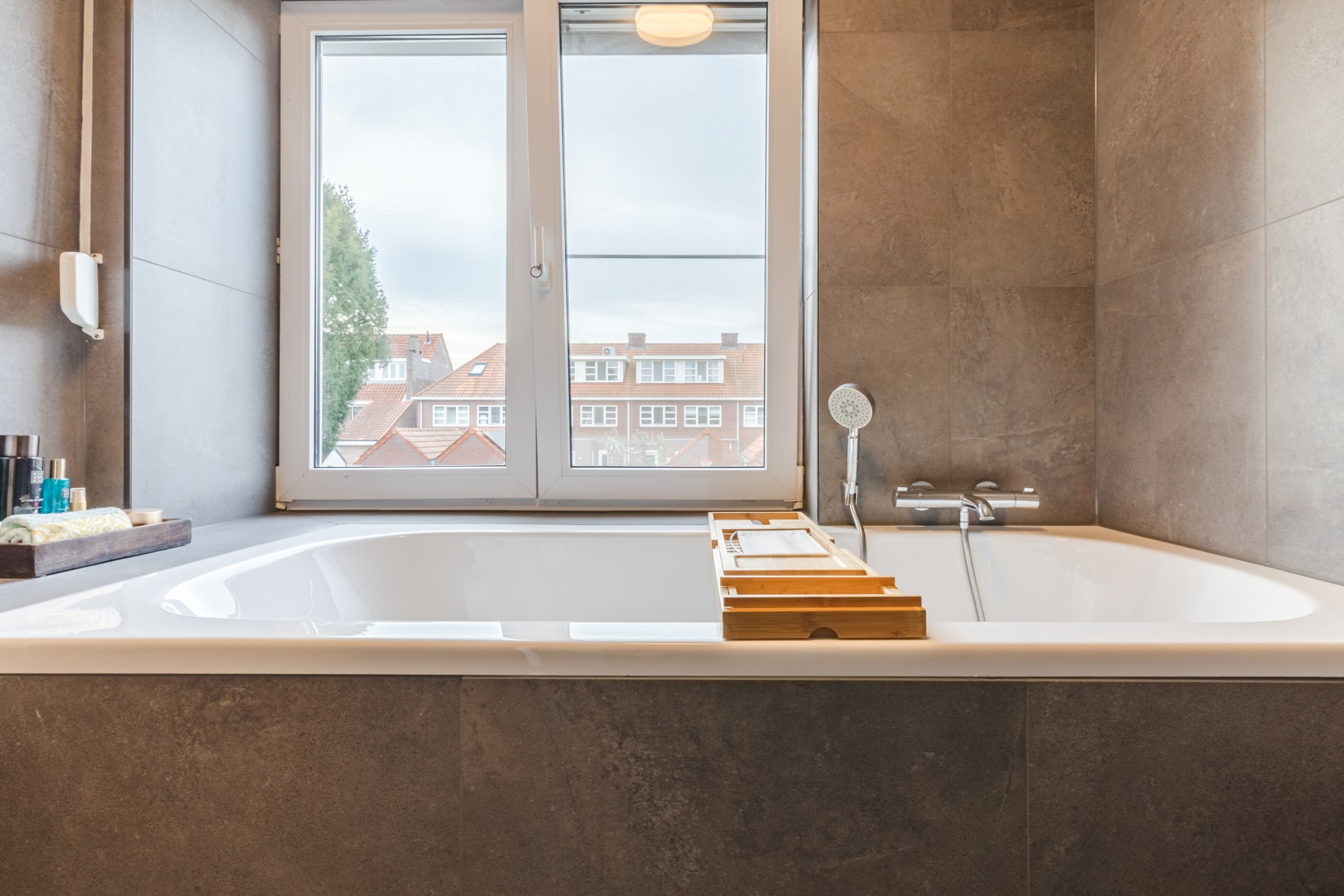 Luxe en moderne, geheel betegelde badkamer (voorheen slaapkamer) voorzien van inloopdouche, ligbad, fraai breed badmeubel met wastafel en designradiator.