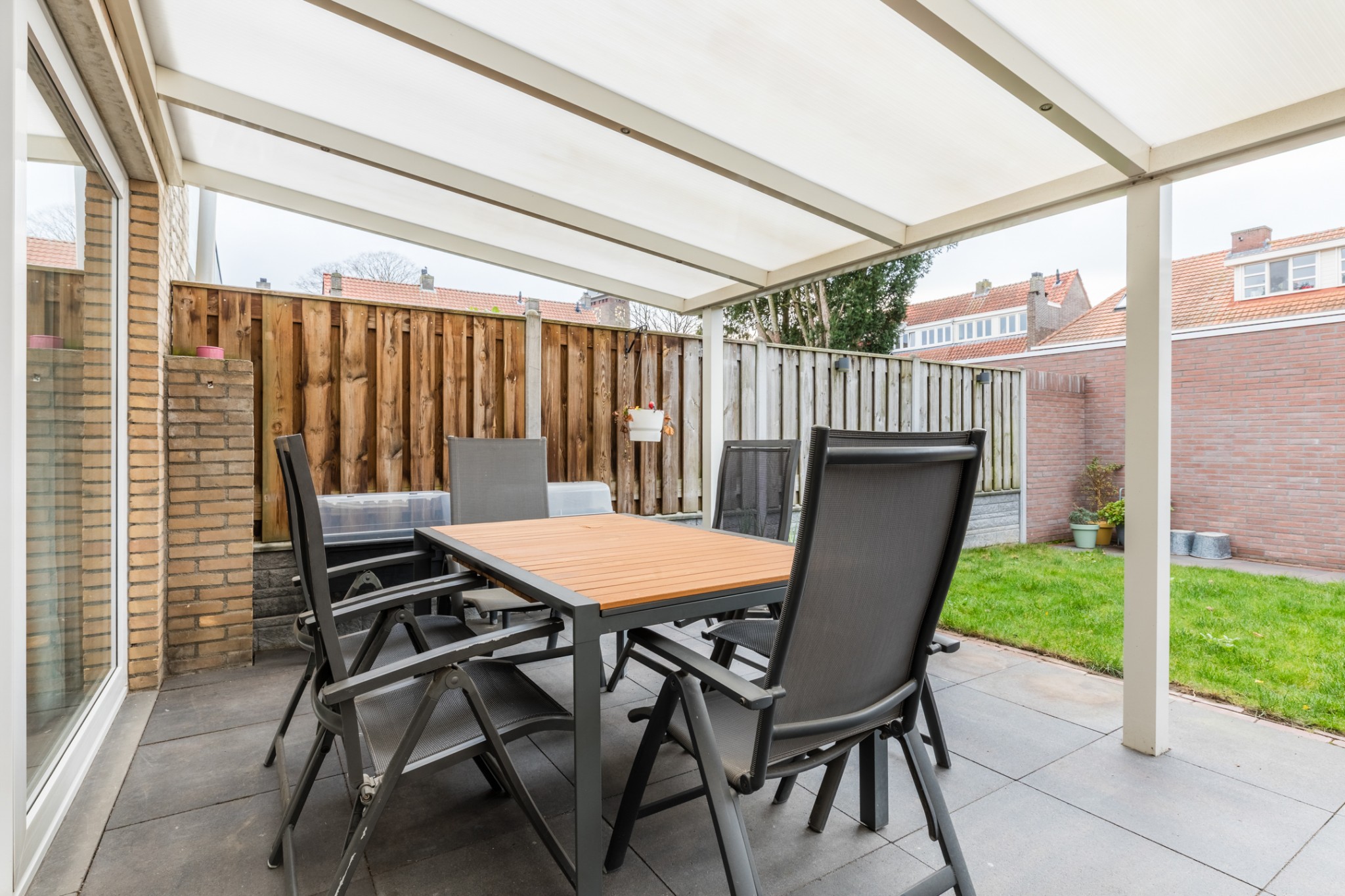 Leuk aangelegde achtertuin, gelegen op het zuidwesten, voorzien van een terrasoverkapping, gazon, borders, vernieuwde berging en naar een afgesloten pleintje.
