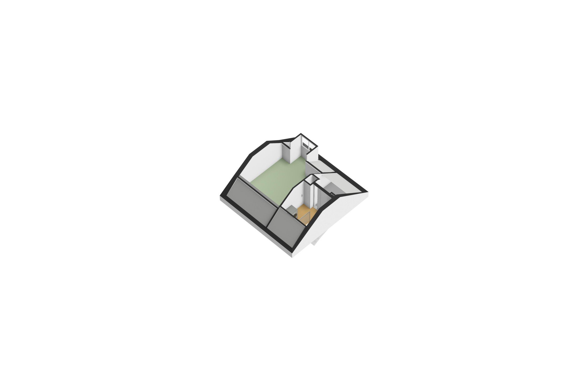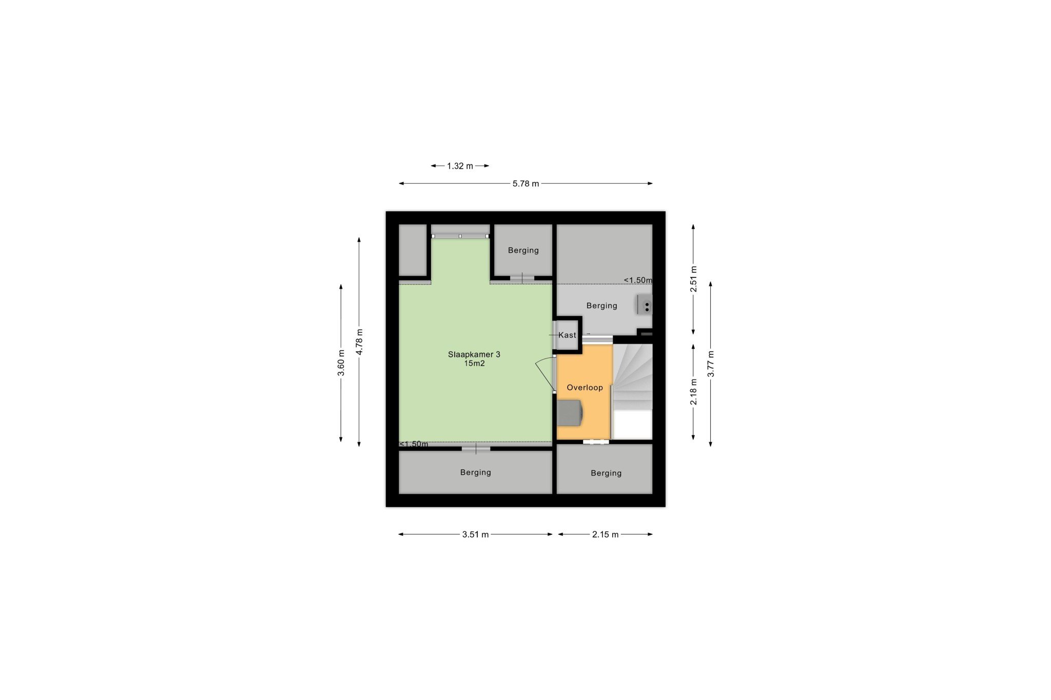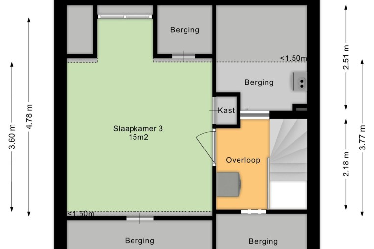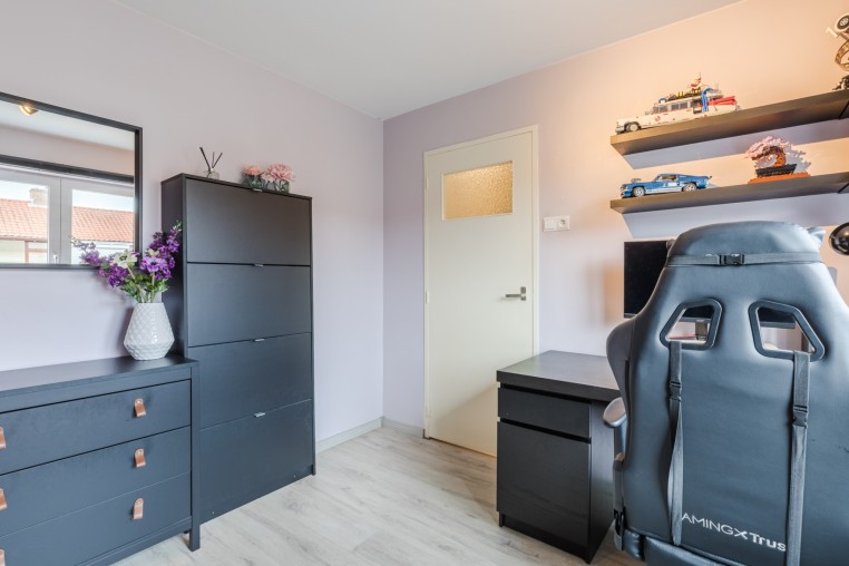 Ruime slaapkamer, ± 15 m², voorzien laminaatvloer, dakkapel, handmatig bedienbaar rolluik, inbouwkast en bergruimte onder de kapschuinte.