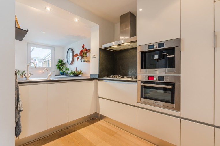 Moderne open keuken met laminaatvloer, inrichting in hoekopstelling, natuurstenen aanrechtblad, eetbar, diverse onder- en bovenkasten en inbouwapparatuur t.w.: 5-pits gaskookplaat, afzuigkap, combi-oven, koffiezetapparaat, vaatwasser en een Quooker.