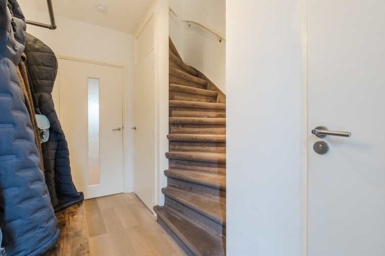 Hal met laminaatvloer, praktische trapkast met uitgebreide groepenkast en trapopgang naar 1e verdieping.