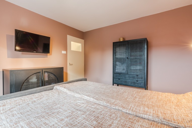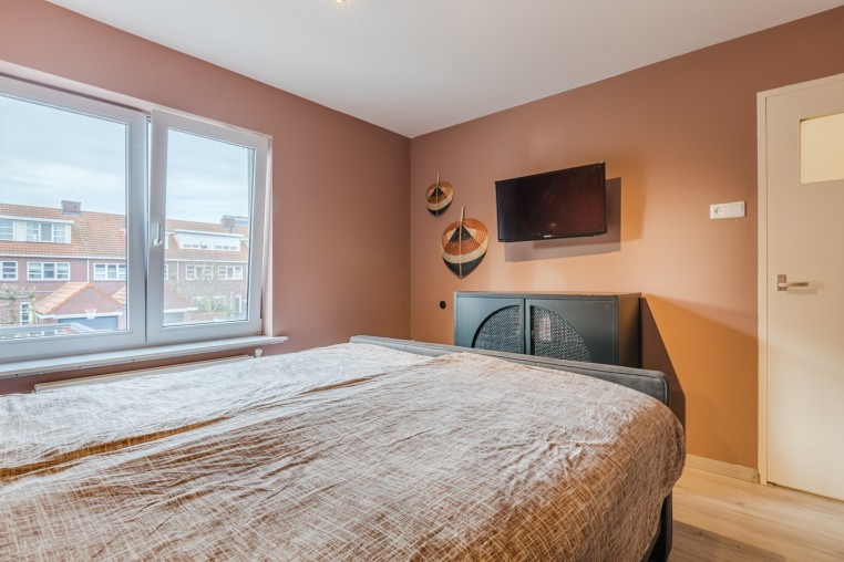 Slaapkamer, ± 12 m², met laminaatvloer, tv-aansluiting en handmatig bedienbaar rolluik.