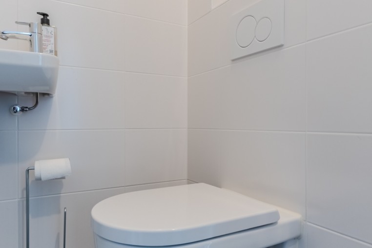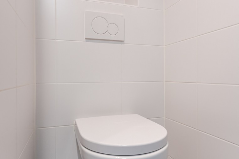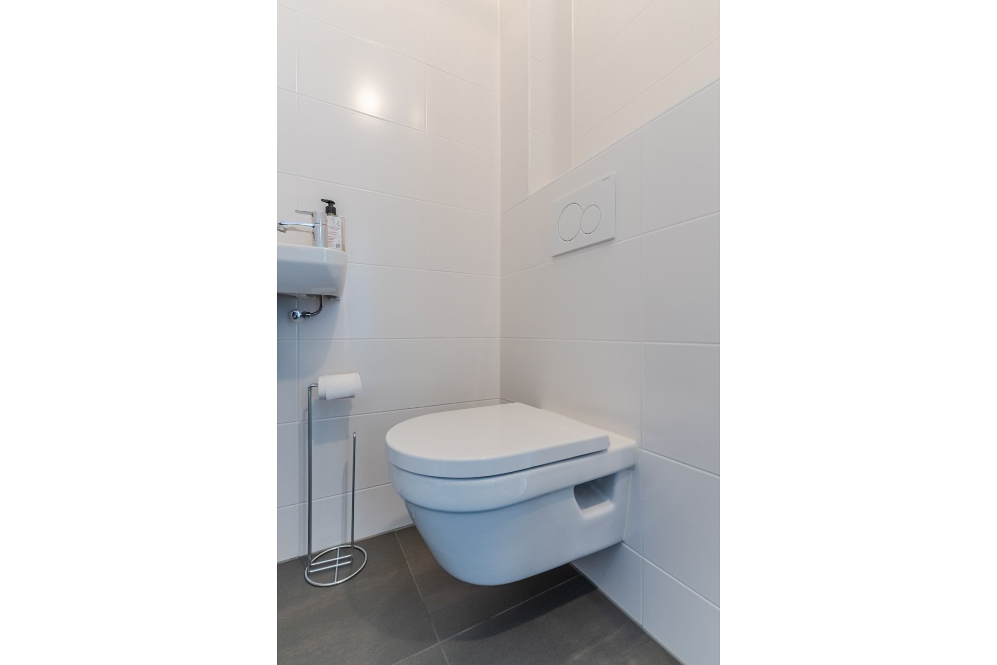 Moderne, tot plafond betegeld toiletruimte met hangend toilet en fonteintje.