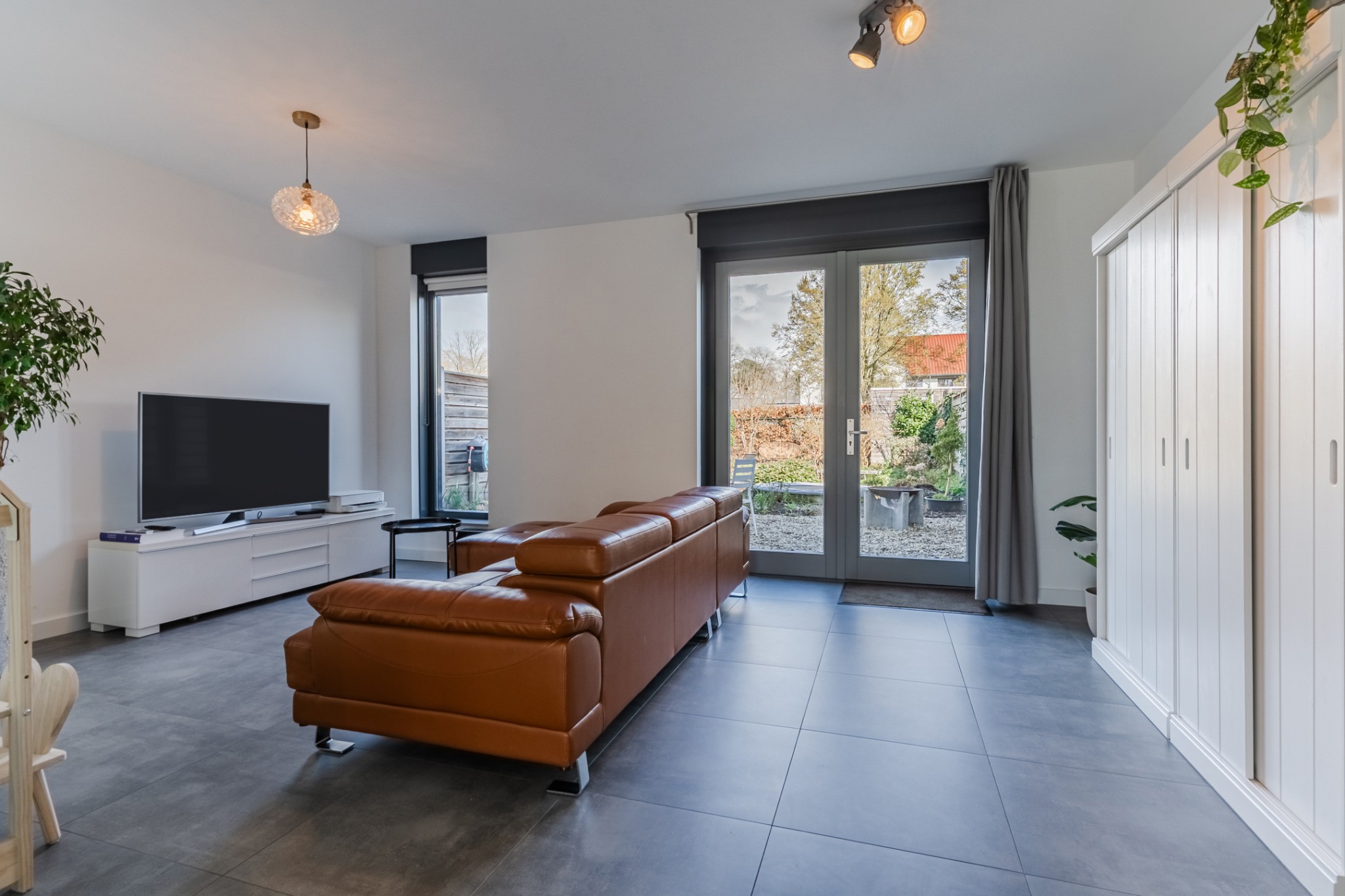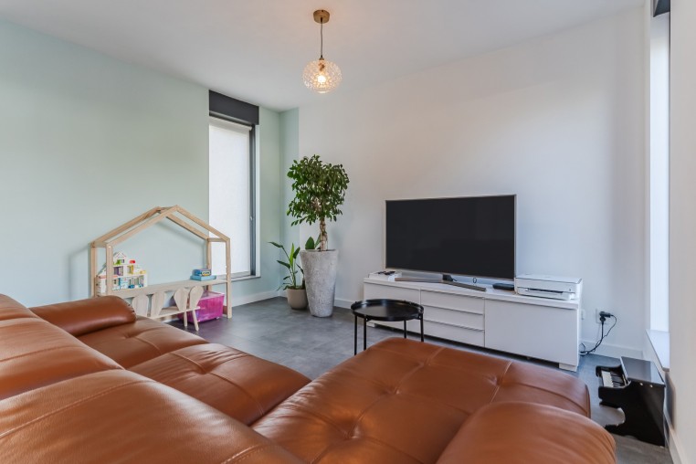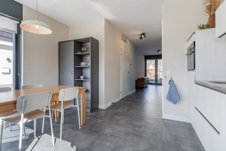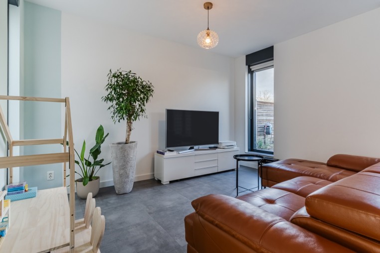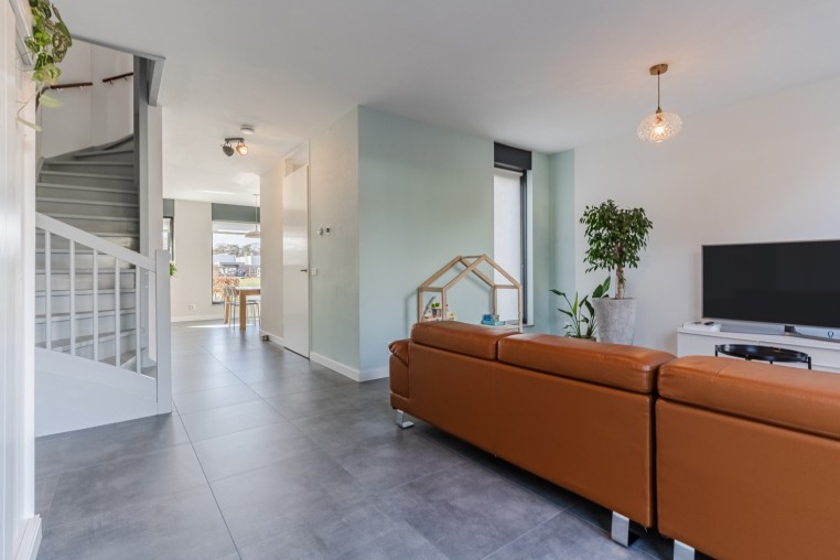 Sfeervolle woonkamer, ± 44 m² (incl. keuken) met veel lichtinval, voorzien van tegelvloer met vloerverwarming, glad gestucte wanden, ruime bergkast met tegelvloer en unit t.b.v. vloerverwarming. Tuindeur naar de diepe achtertuin.