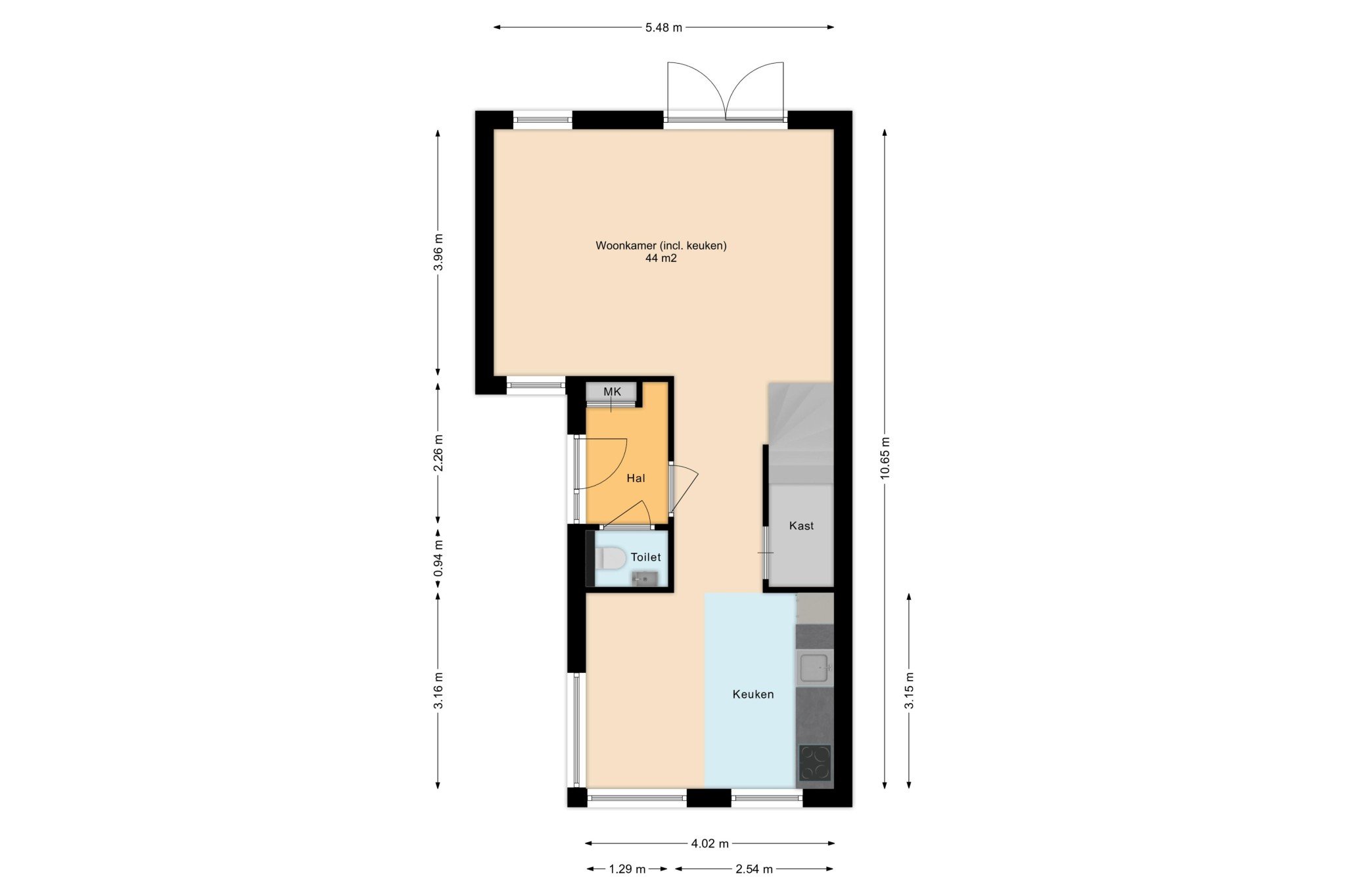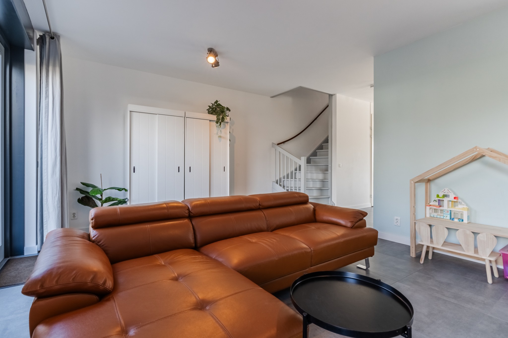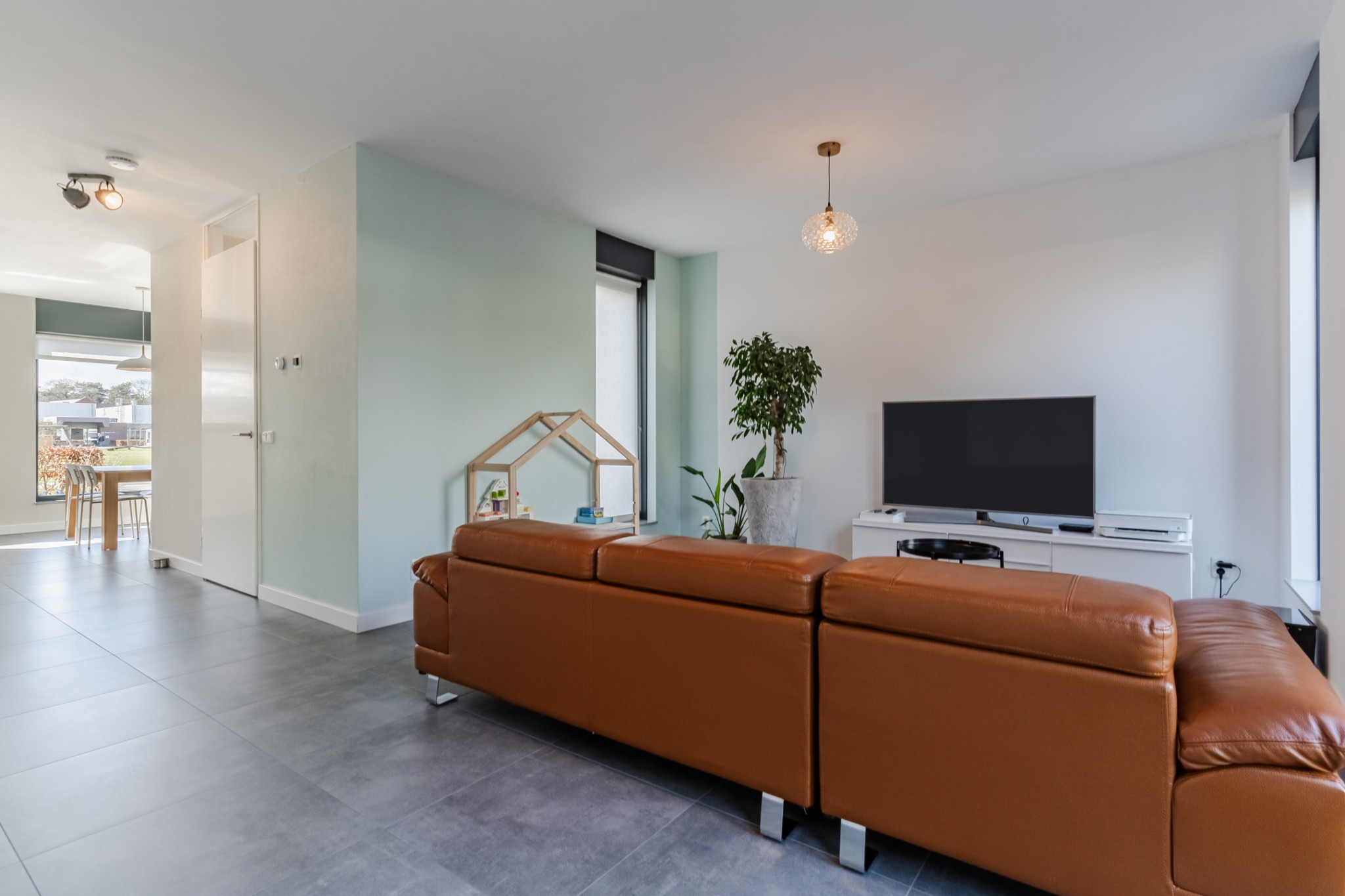 Sfeervolle woonkamer, ± 44 m² (incl. keuken) met veel lichtinval, voorzien van tegelvloer met vloerverwarming, glad gestucte wanden, ruime bergkast met tegelvloer en unit t.b.v. vloerverwarming. Tuindeur naar de diepe achtertuin.