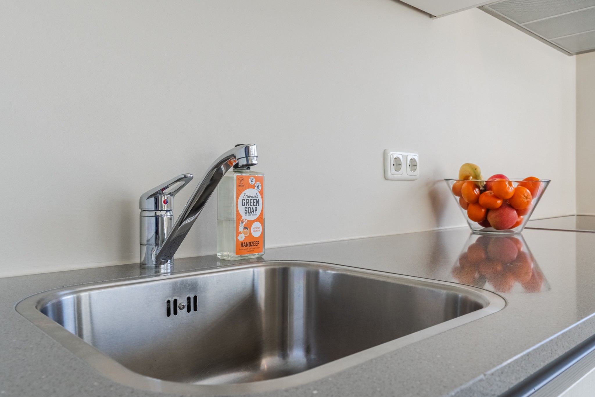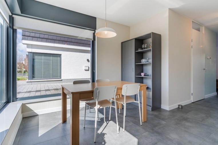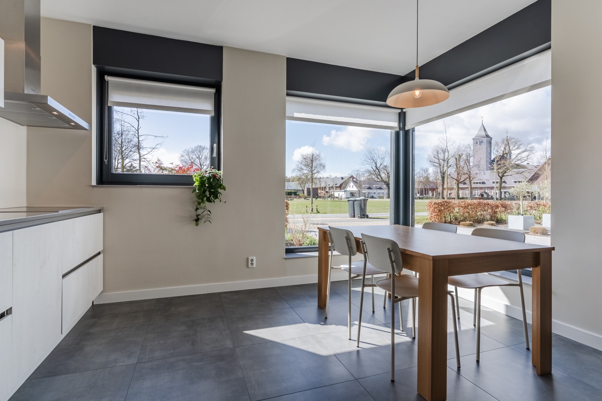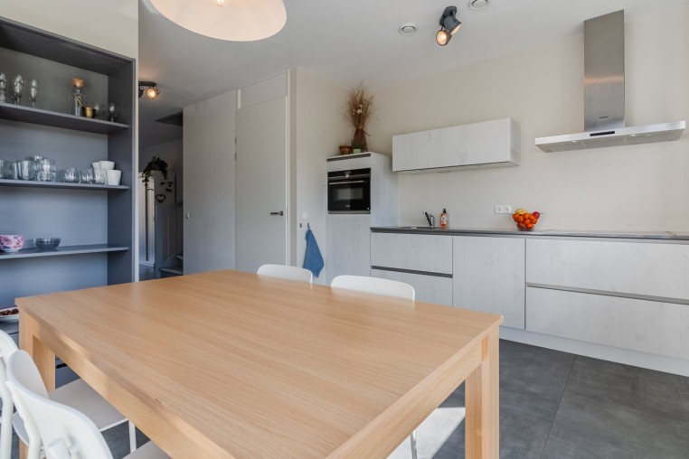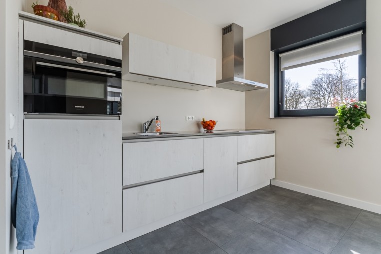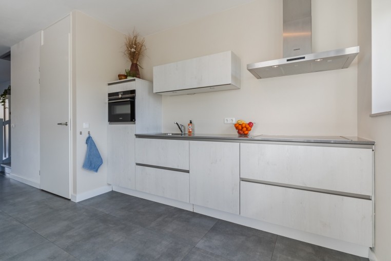Open keuken met moderne inrichting, diverse onder- en bovenkasten en inbouwapparatuur, t.w.: kookplaat, afzuigkap, vaatwasser, combi-oven en koelkast. De keuken is voorzien van een tegelvloer met vloerverwarming. Fraai vrij uitzicht.