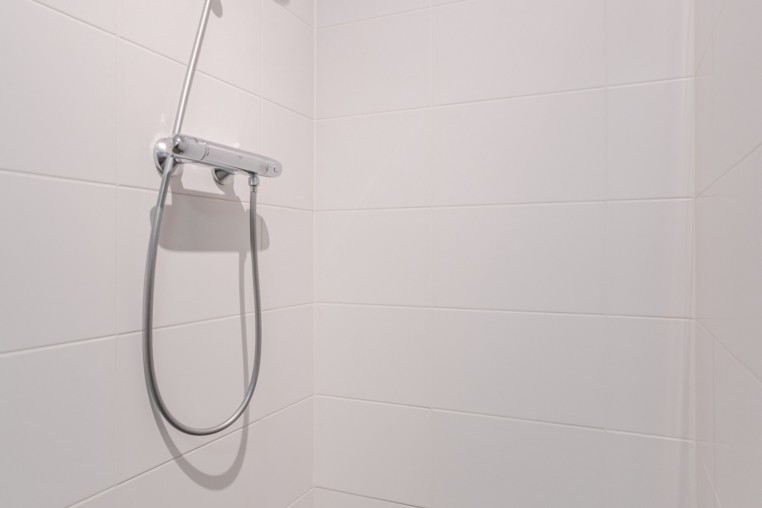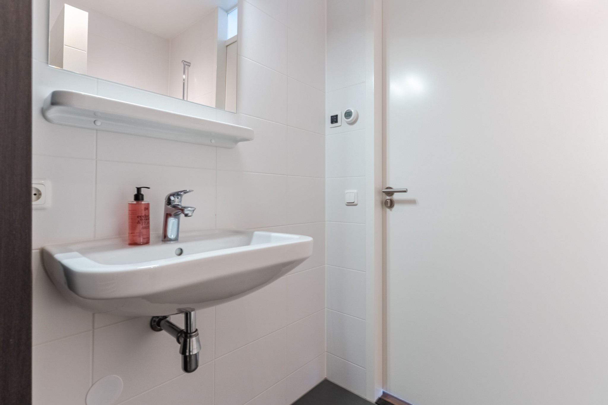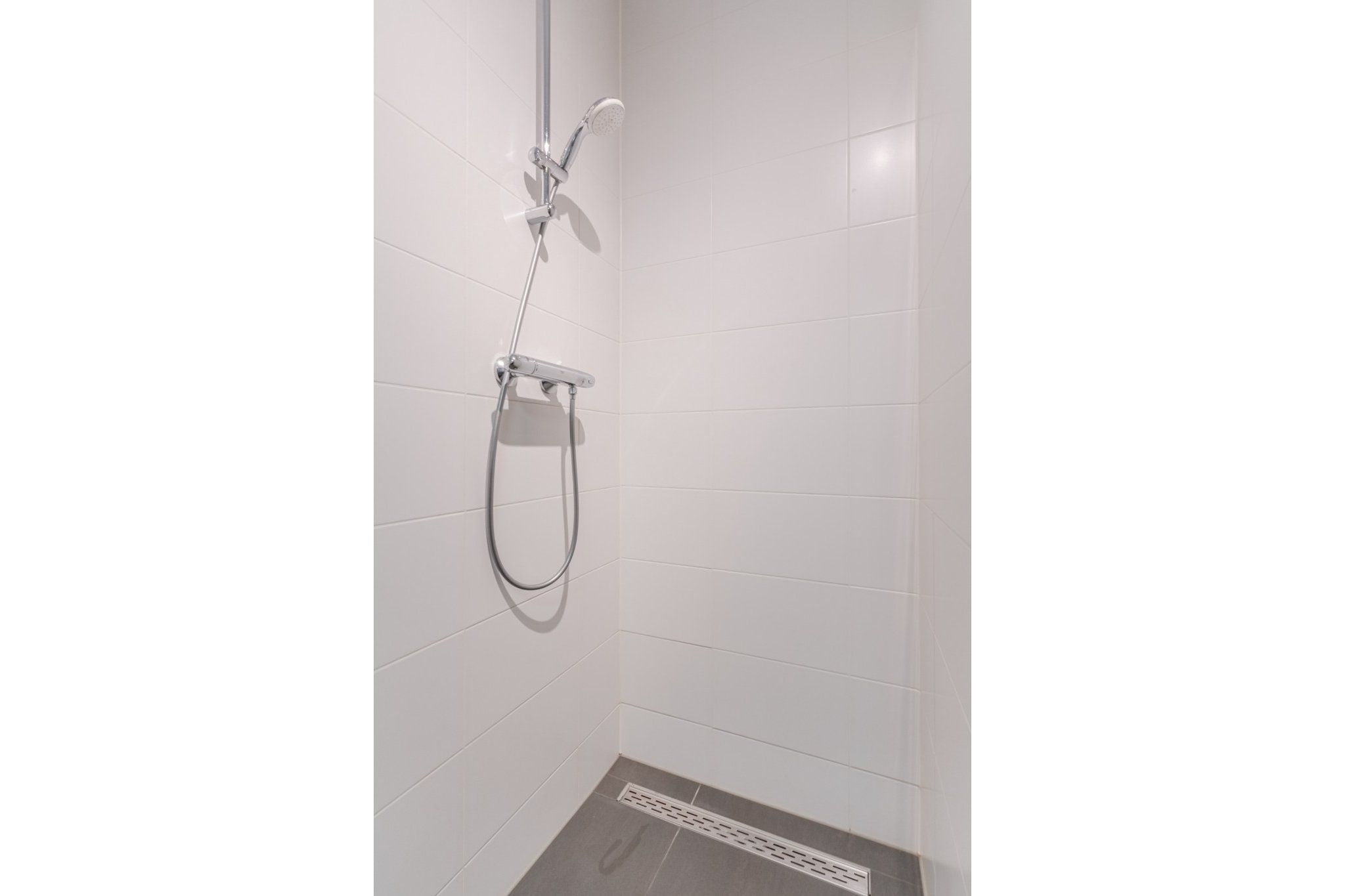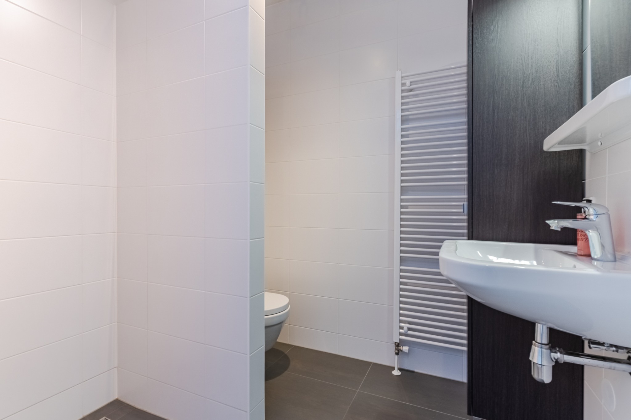 Moderne, tot plafond betegelde badkamer met inloopdouche, hangend toilet, vaste wastafel en designradiator.