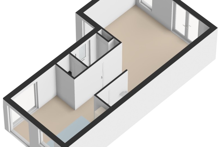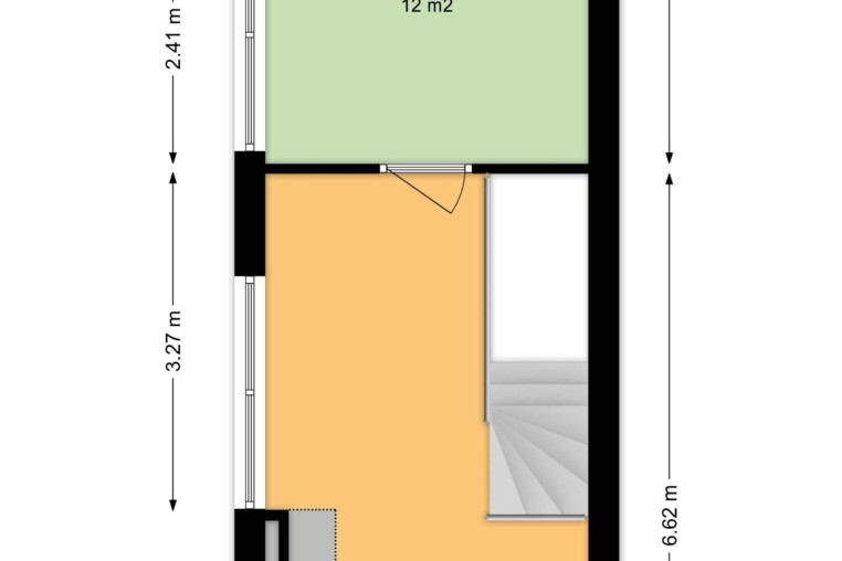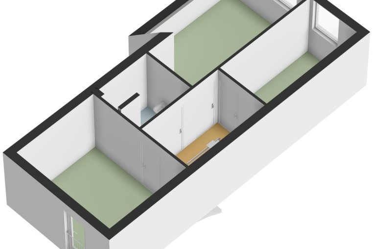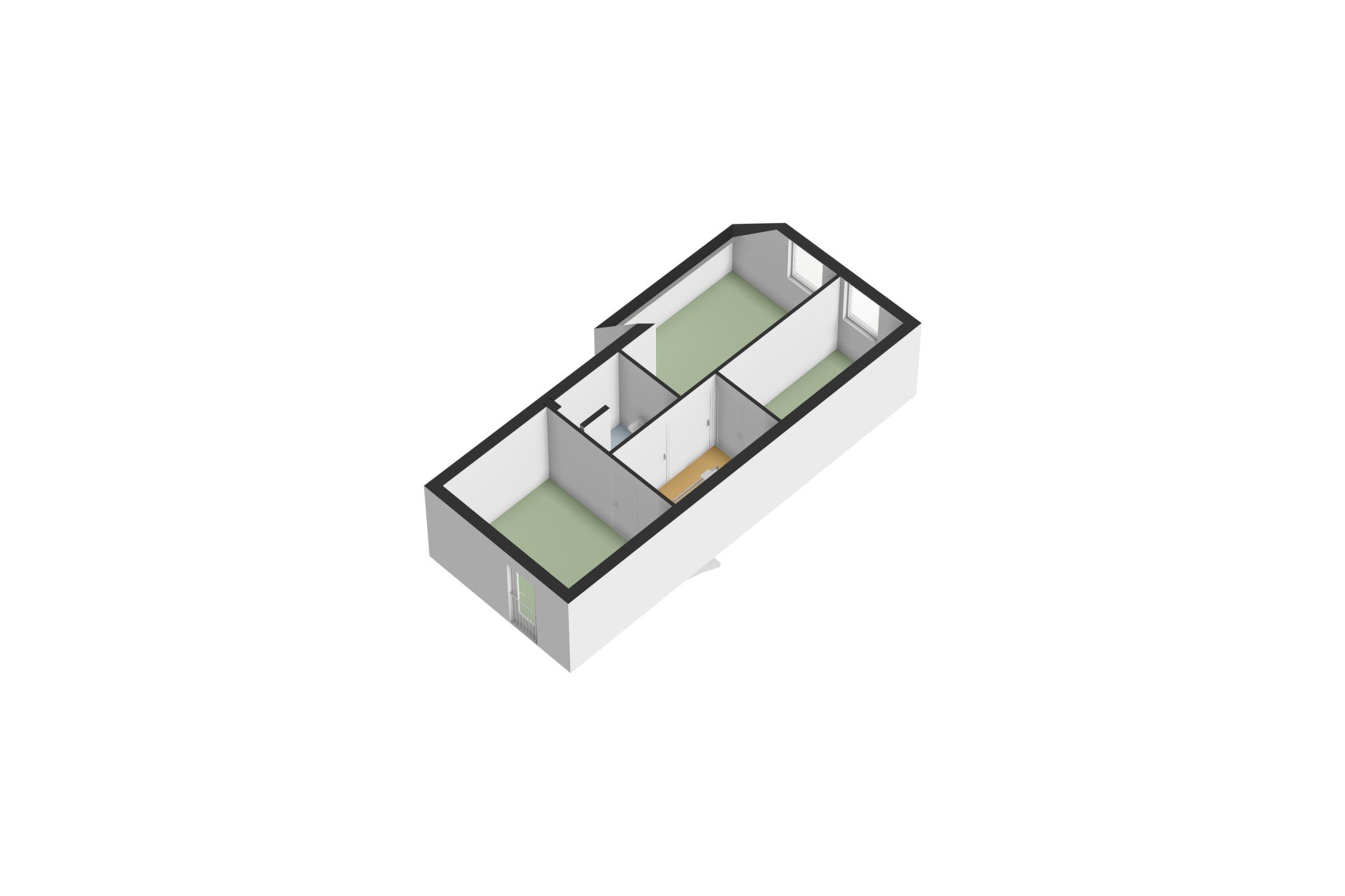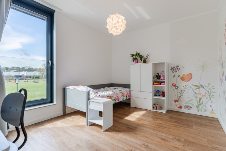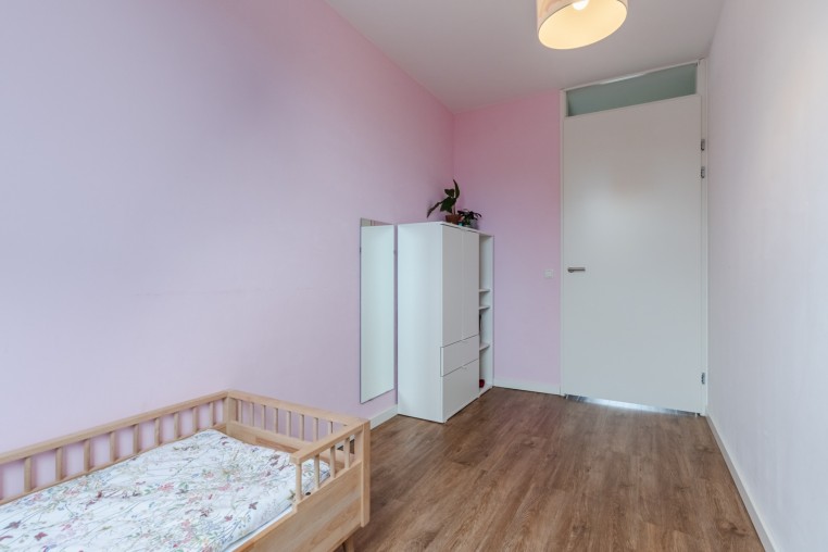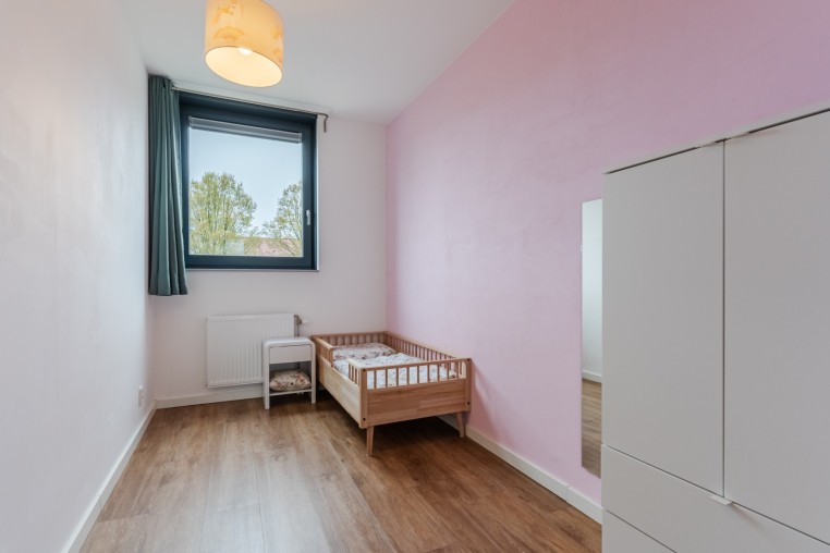 Slaapkamer, ± 8 m², met klik-PVC en hoog draai-/kiepraam.