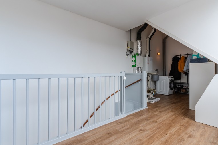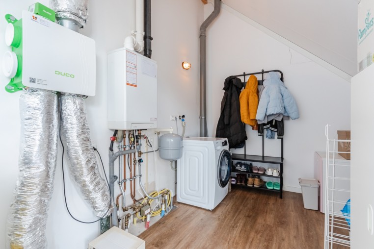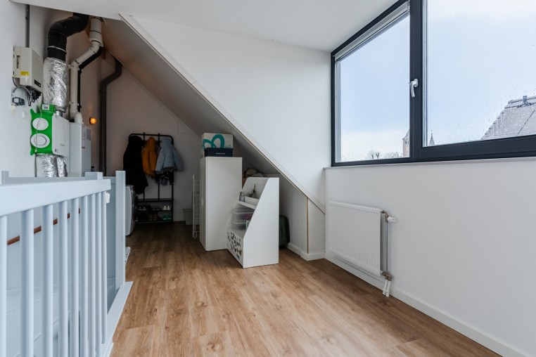 Bereikbaar middels vaste trap, royale voorzolder met klik-PVC, grote dakkapel, omvormer t.b.v. zonnepanelen, combi-ketel (Intergas HRE, ± 2019) unit t.b.v. mechanische ventilatie, aansluiting wasmachine en afvoer droger.