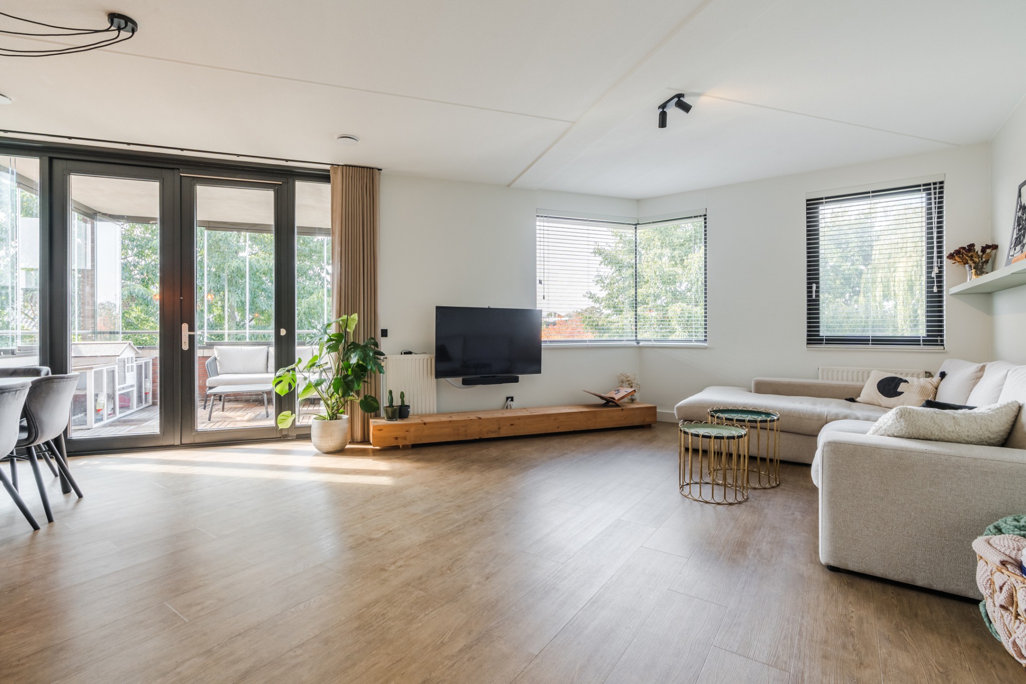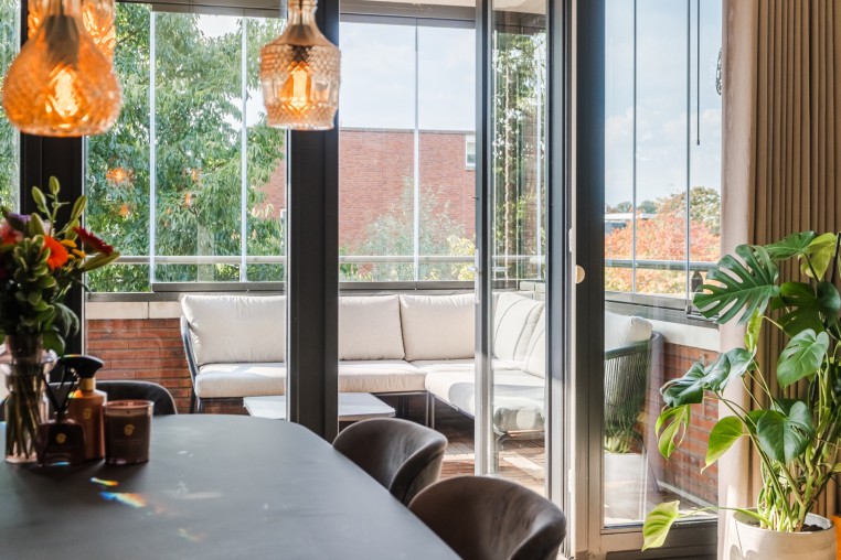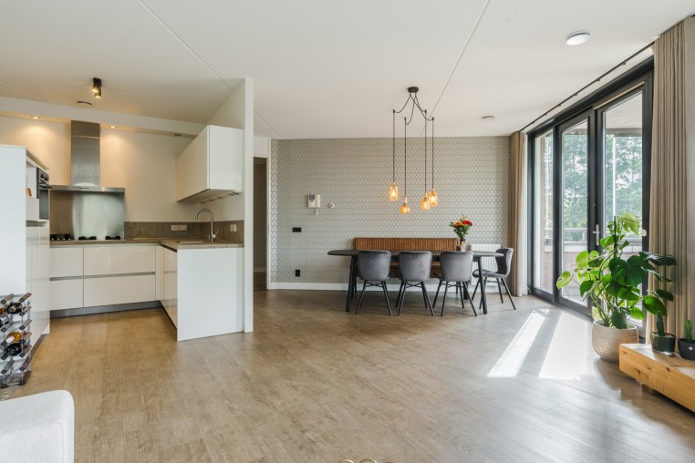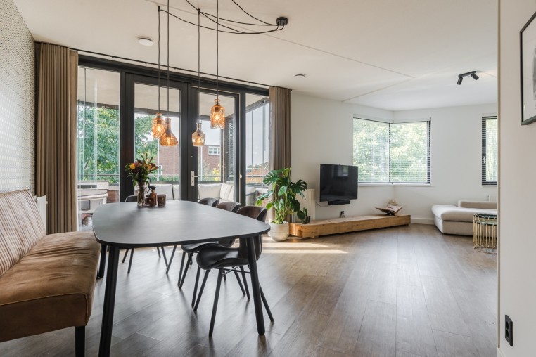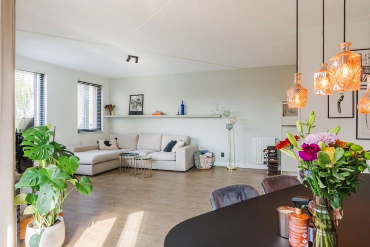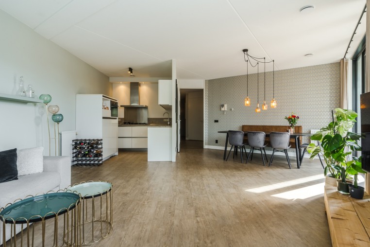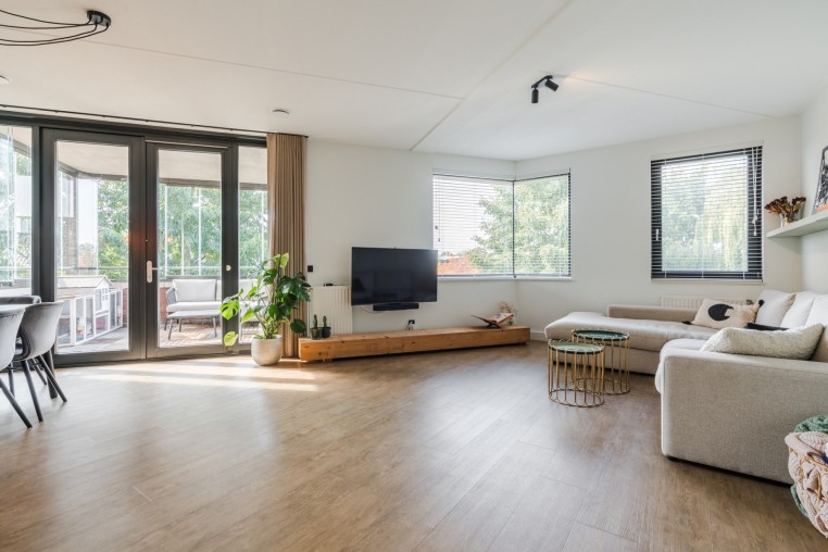 Sfeervolle ruime woonkamer (± 42 m² incl. keuken) voorzien van PVC vloer en dubbele deur naar royaal balkon met houten vlonders. Het balkon is af te sluiten met een glazen schuifwand. Optimaal genieten van alle jaargetijden.