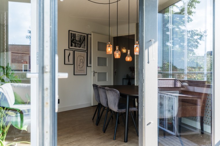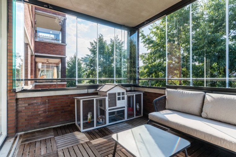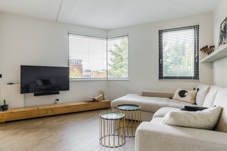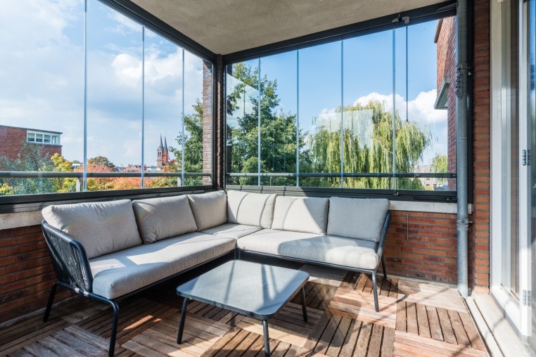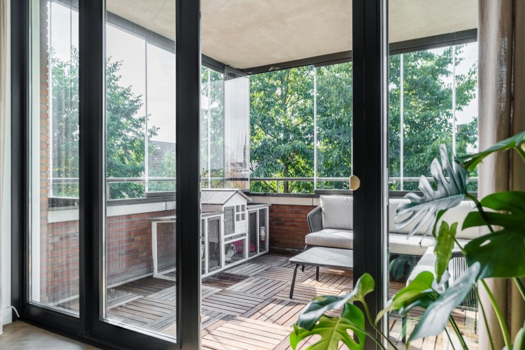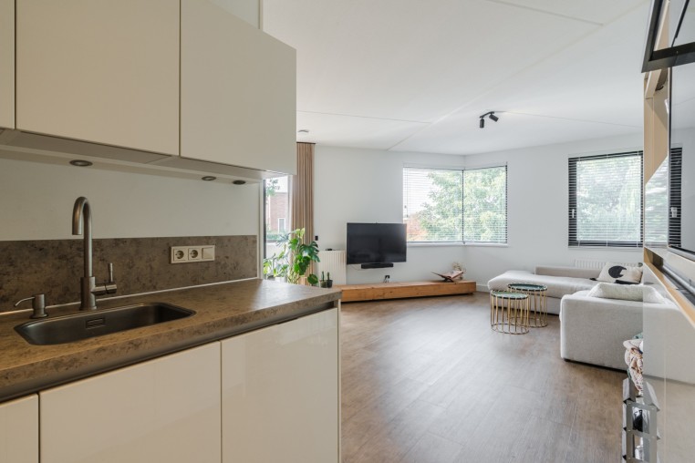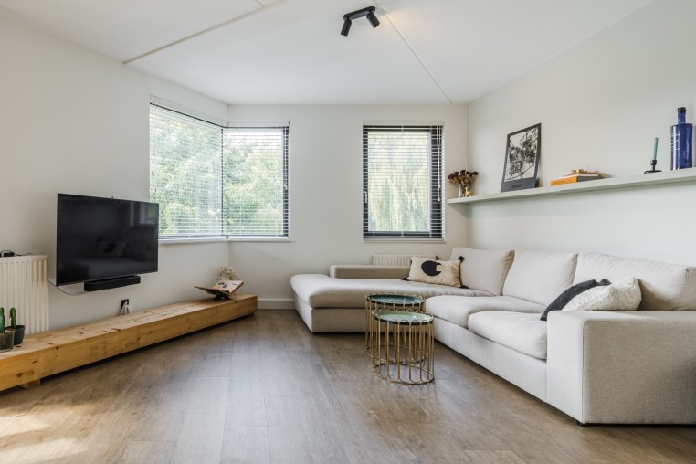 Sfeervolle ruime woonkamer (± 42 m² incl. keuken) voorzien van PVC vloer en dubbele deur naar royaal balkon met houten vlonders. Het balkon is af te sluiten met een glazen schuifwand. Optimaal genieten van alle jaargetijden.