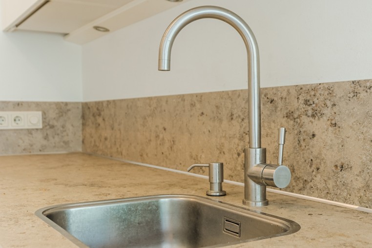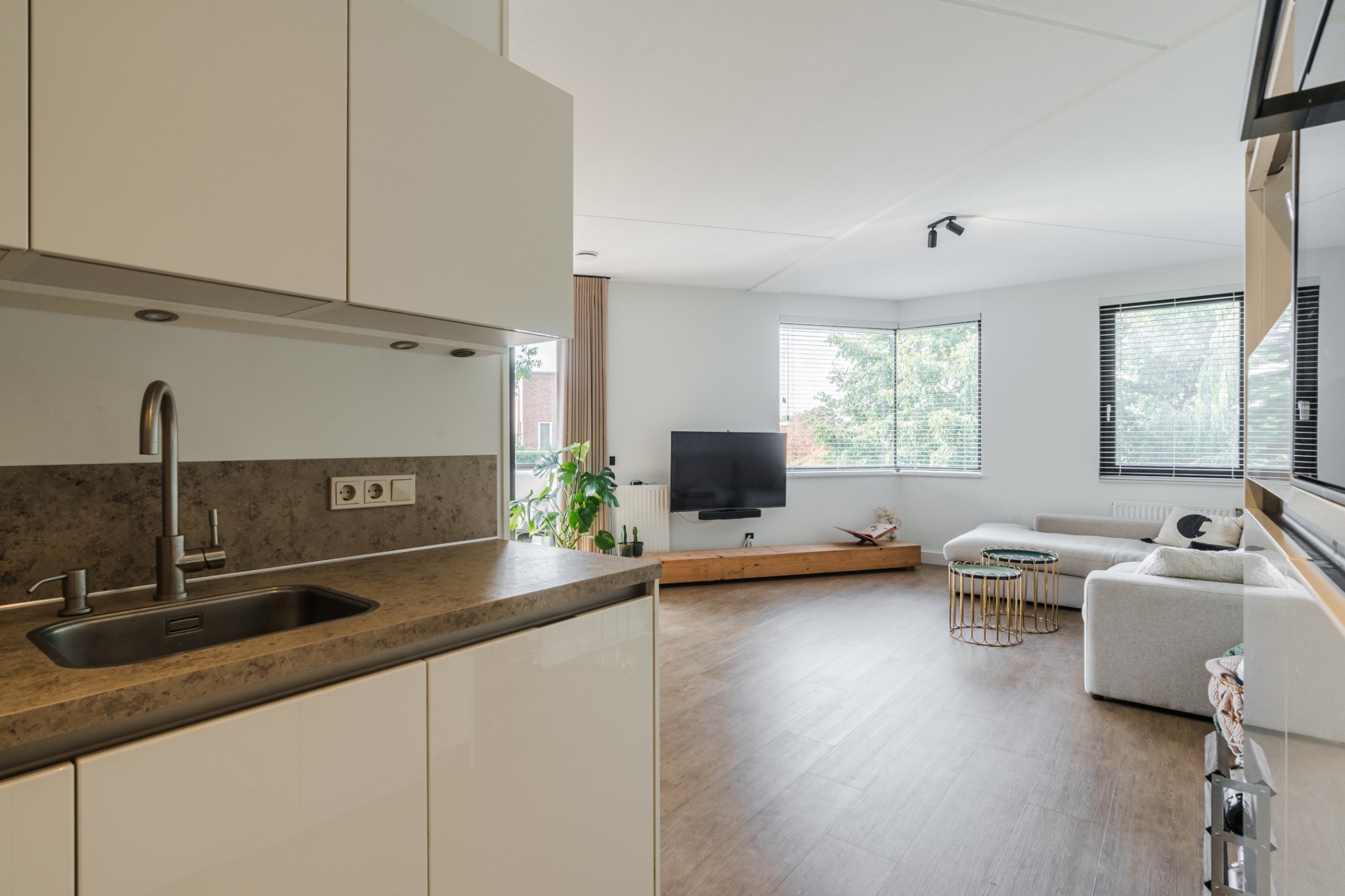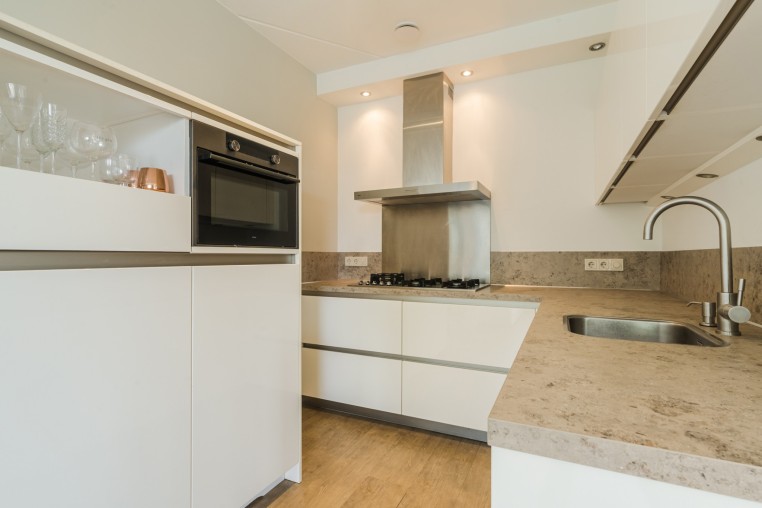 Moderne open keuken voorzien van PVC vloer. Luxe inrichting in hoekopstelling, voorzien van diverse onder- en bovenkasten en inbouwapparatuur t.w.: 5-pits gaskookplaat, afzuigkap, combi-magnetron (2025), koelkast en vaatwasser (2023).
