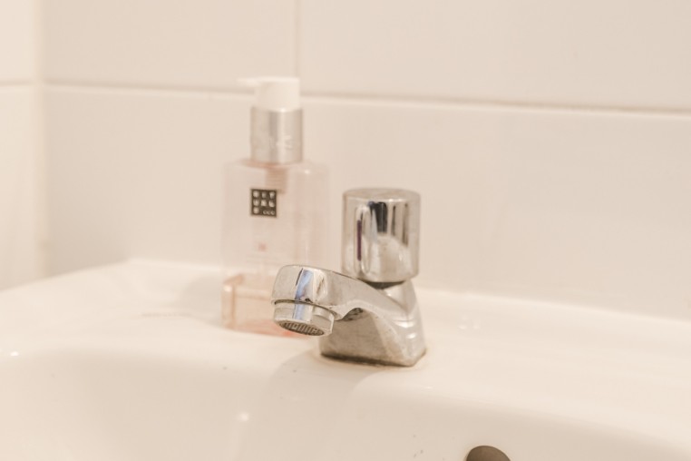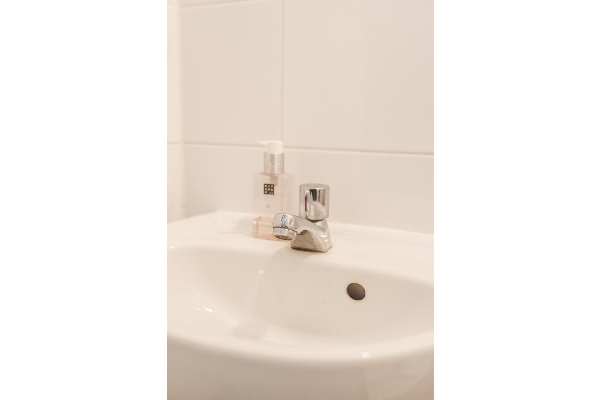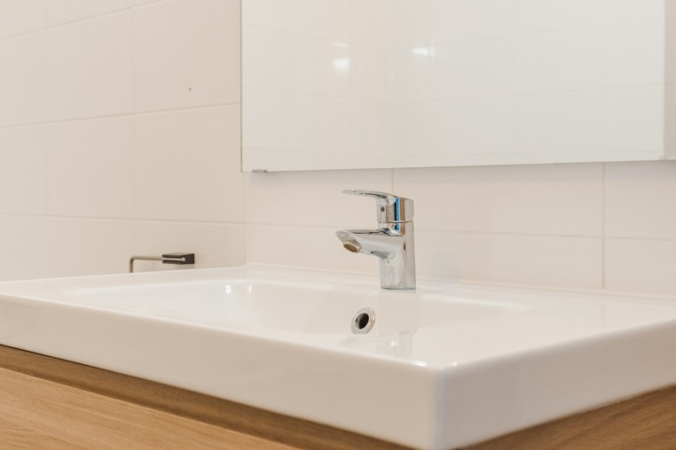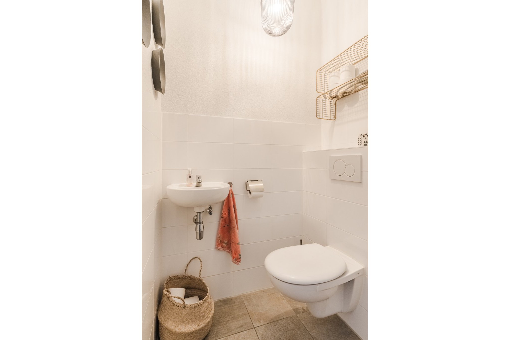 Moderne, deels betegelde toiletruimte met wandcloset en fonteintje.