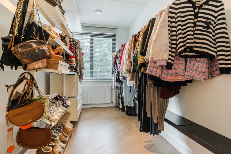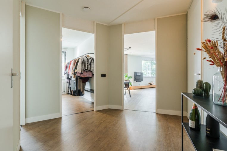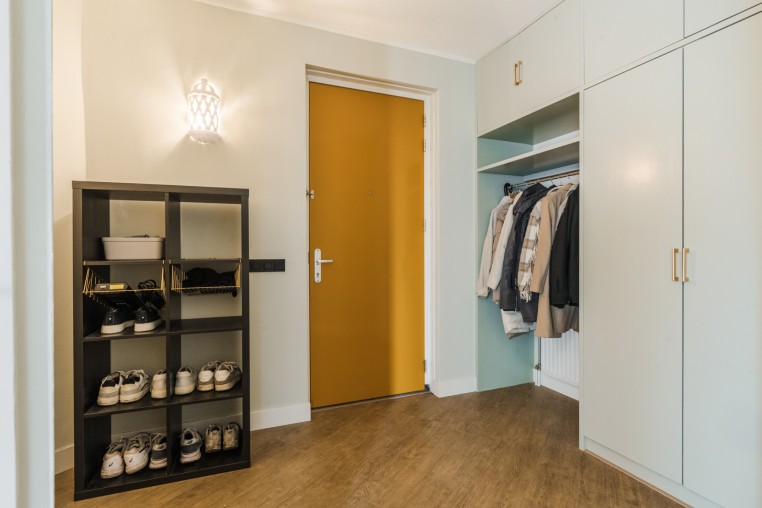 Entree, ruime hal met PVC vloer, garderobenis met inbouwkasten en meterkast met automatische groepen.