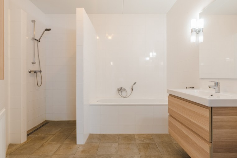 Zeer ruime, tot plafond betegelde badkamer voorzien van ligbad, separate inloopdouche en fraai badmeubel met brede wastafel.
