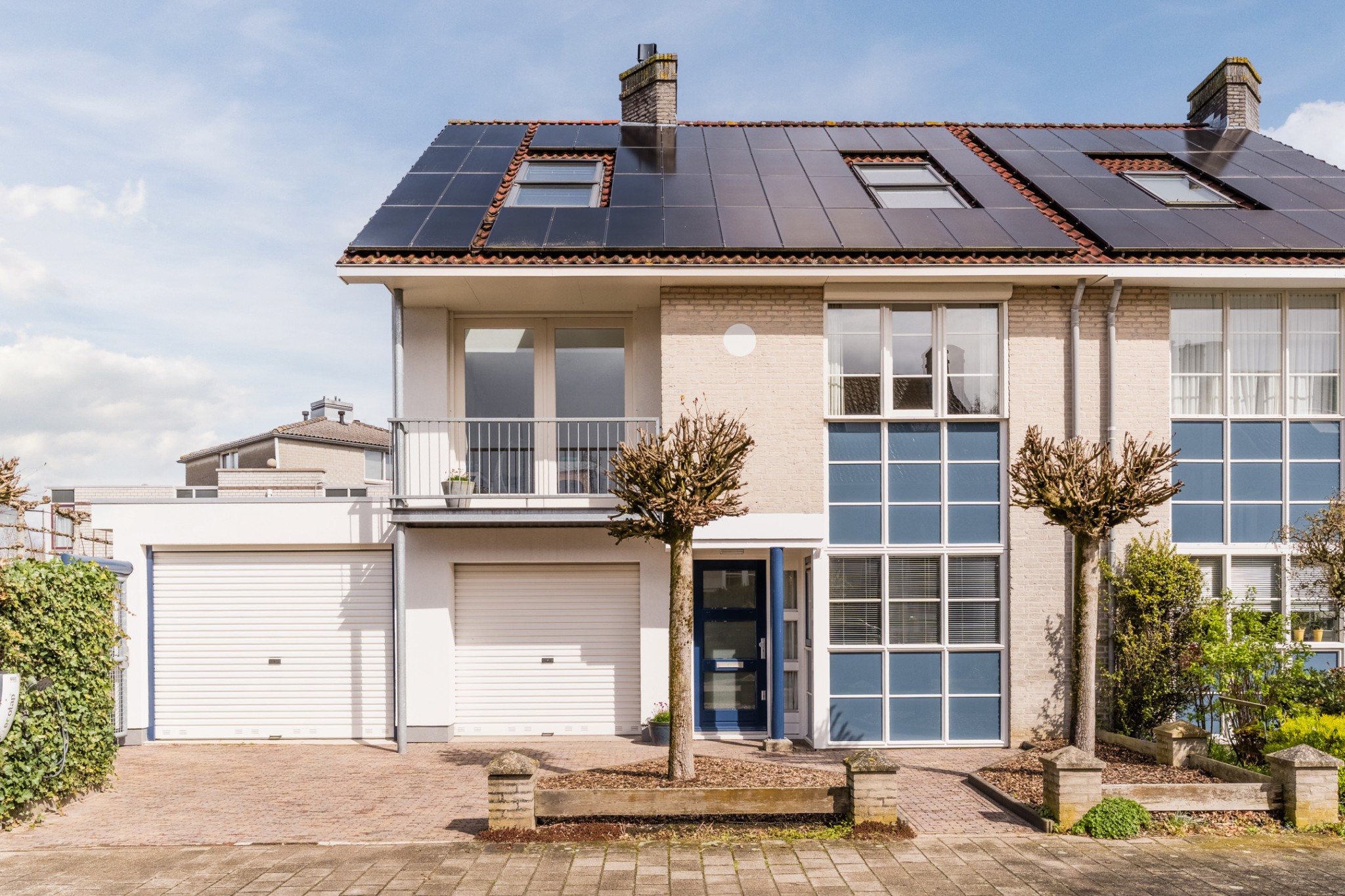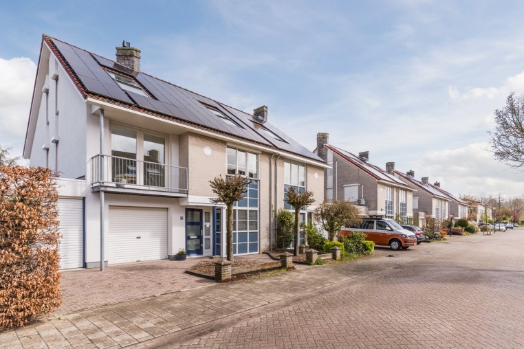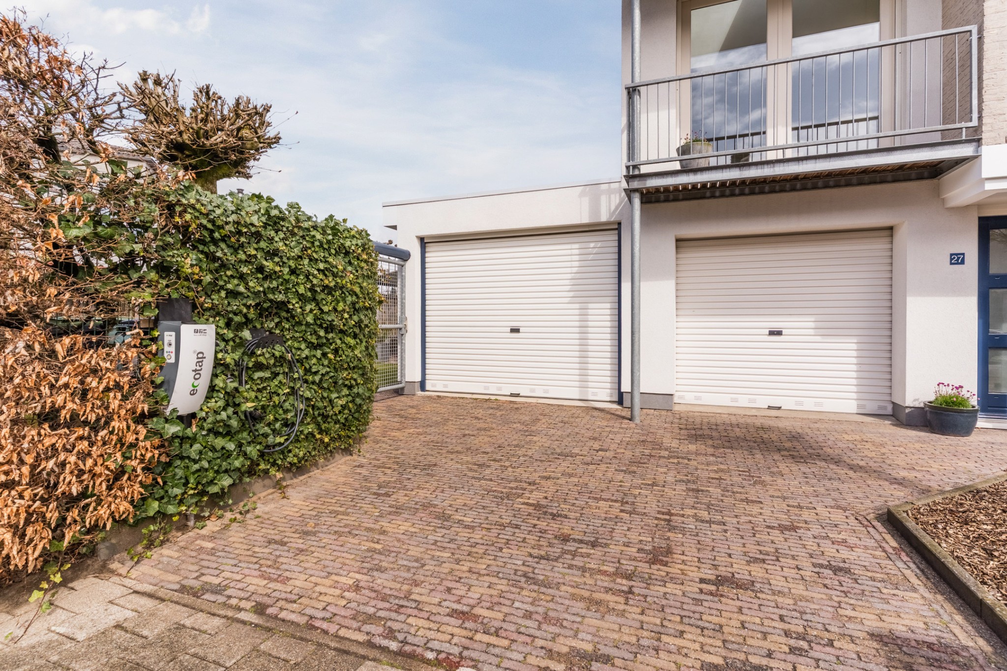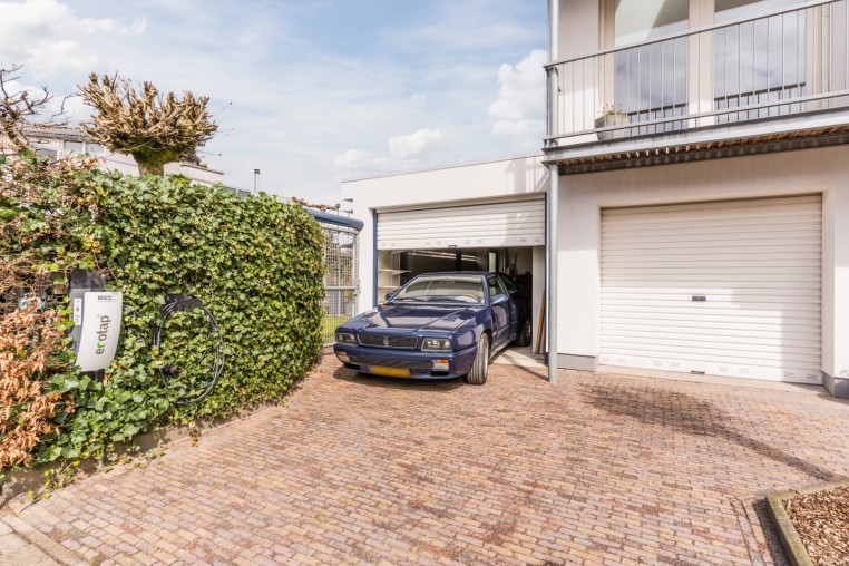 • Voortuin met oprit naar de garages en oplaadpunt elektrische auto.