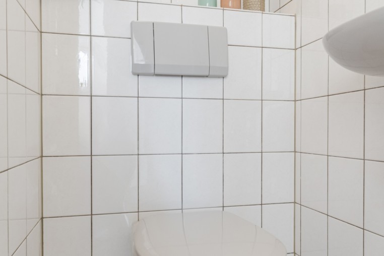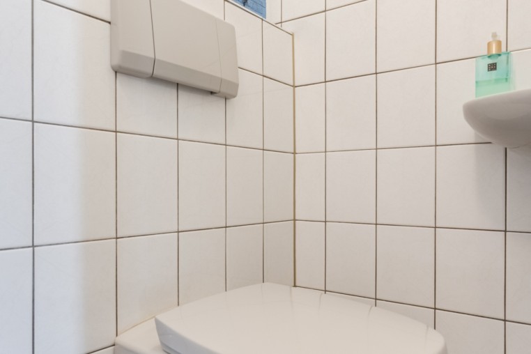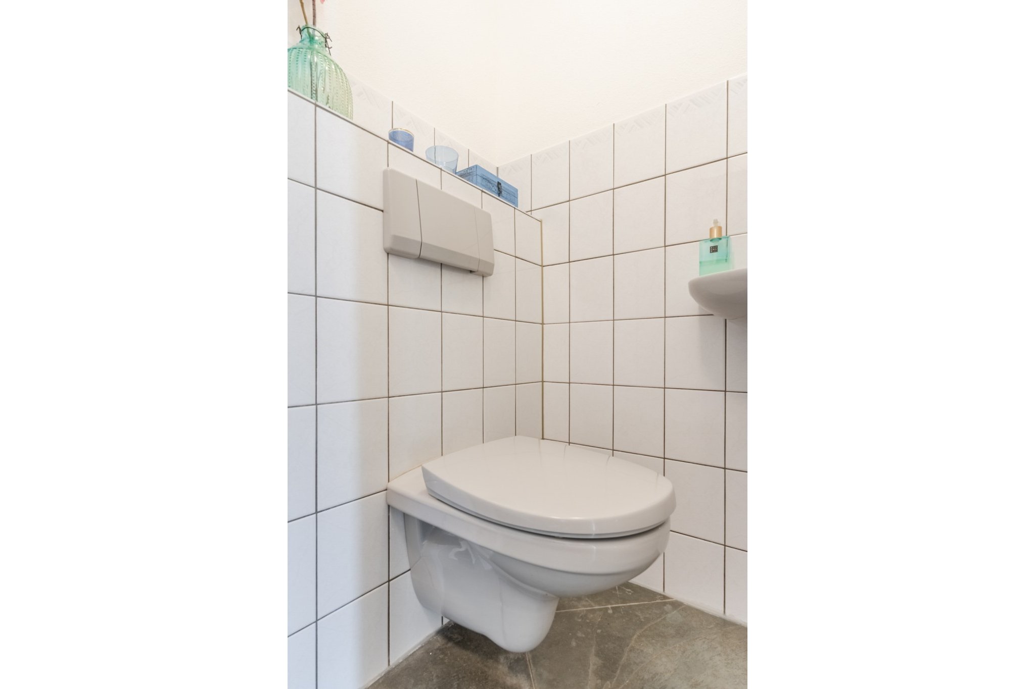 Toilet 2, deels betegelde nette toiletruimte met hangend toilet en fonteintje.