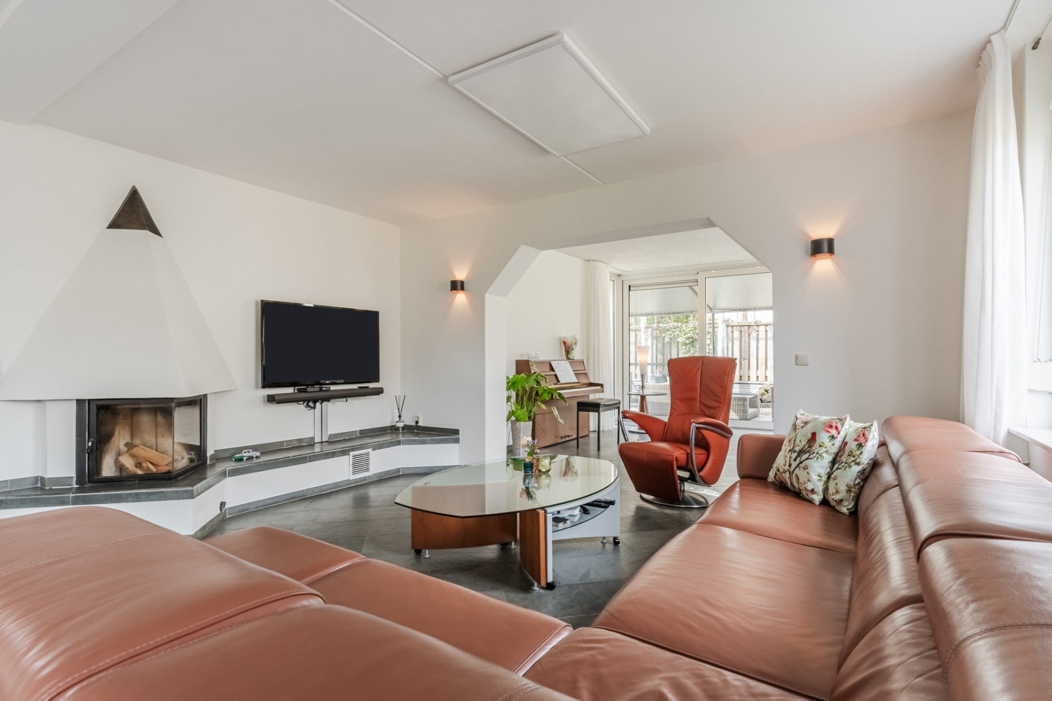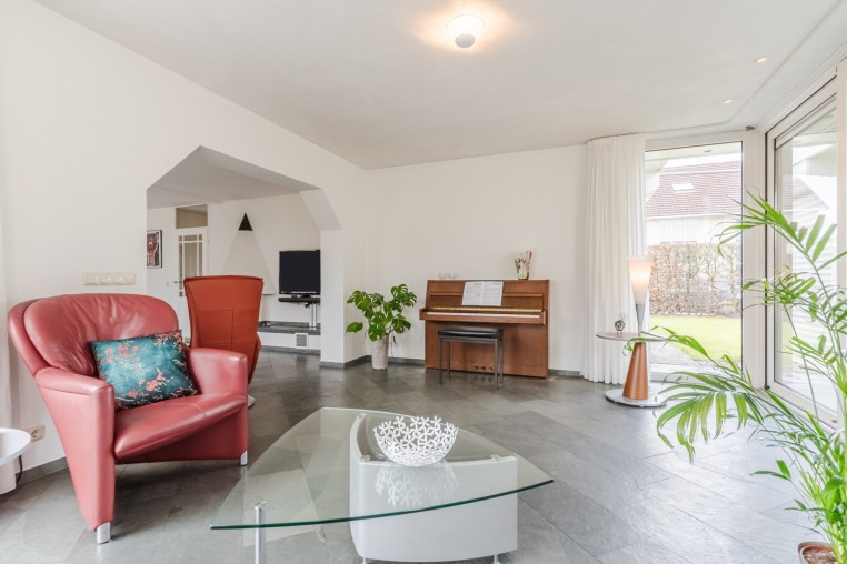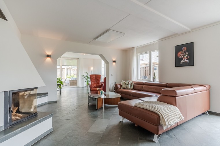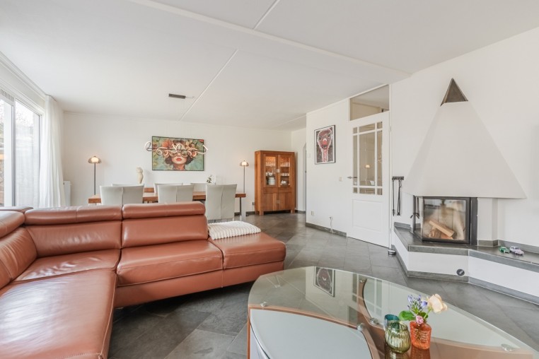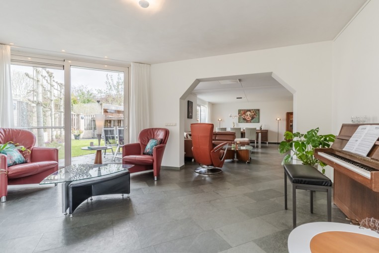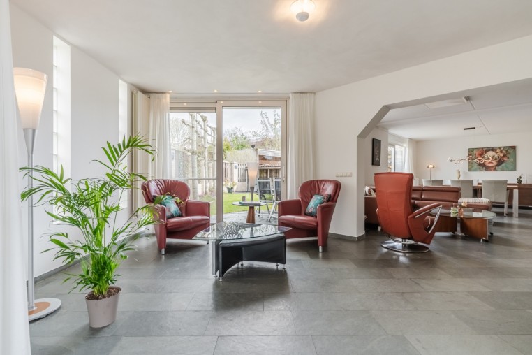 Living, zeer royaal, ± 60 m² (door de uitgebouwde tuinkamer), sfeervolle open haard en zeer veel lichtinval door de grote raampartijen en diverse schuifpuien met zicht op de fraai aangelegde tuin.