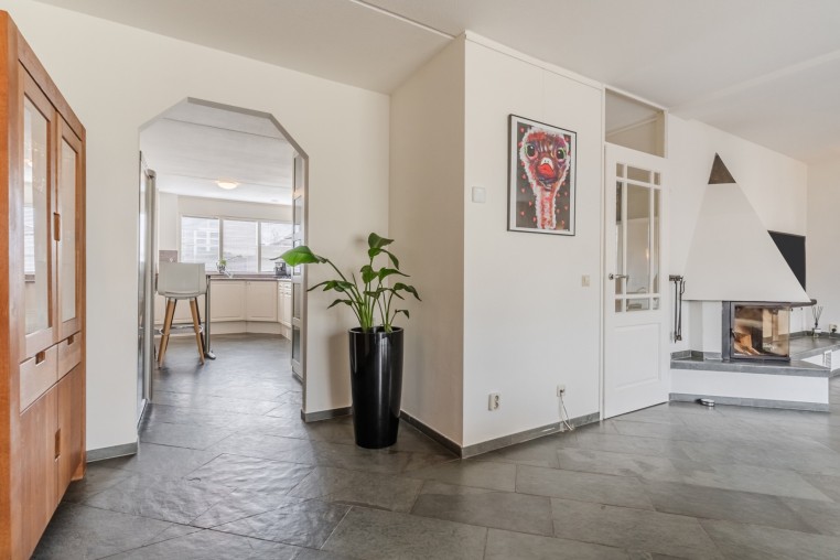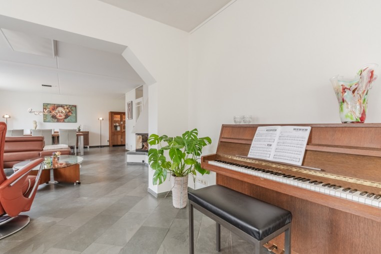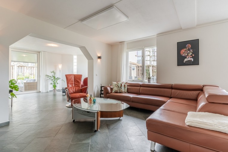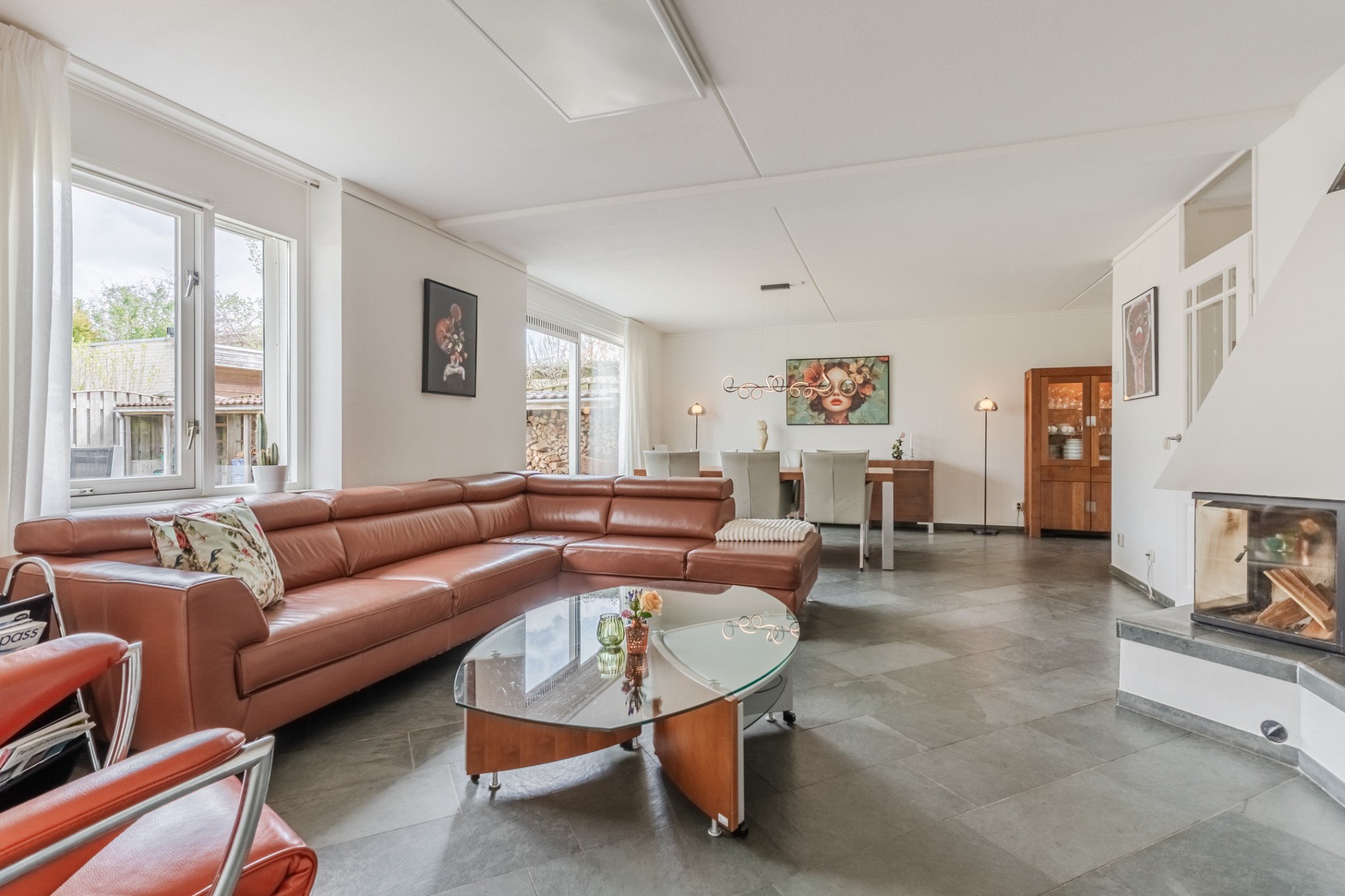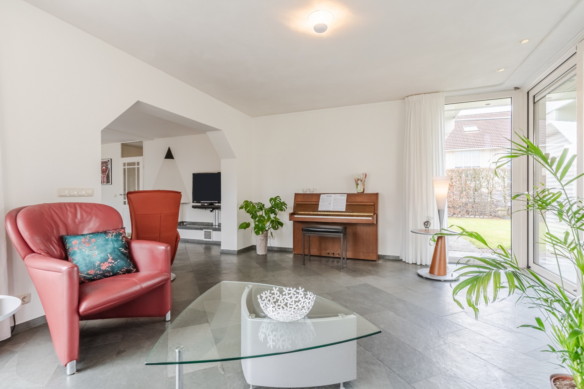 Living, zeer royaal, ± 60 m² (door de uitgebouwde tuinkamer), sfeervolle open haard en zeer veel lichtinval door de grote raampartijen en diverse schuifpuien met zicht op de fraai aangelegde tuin.