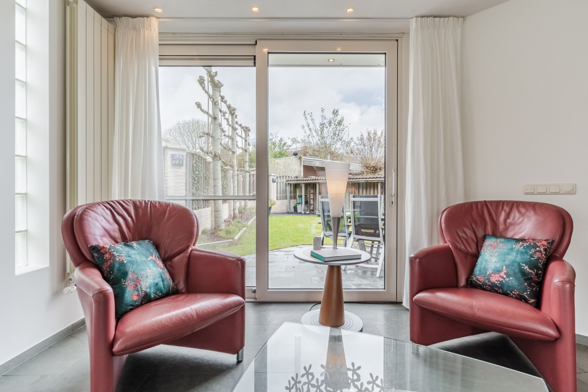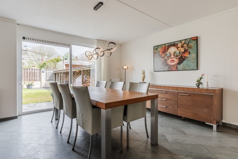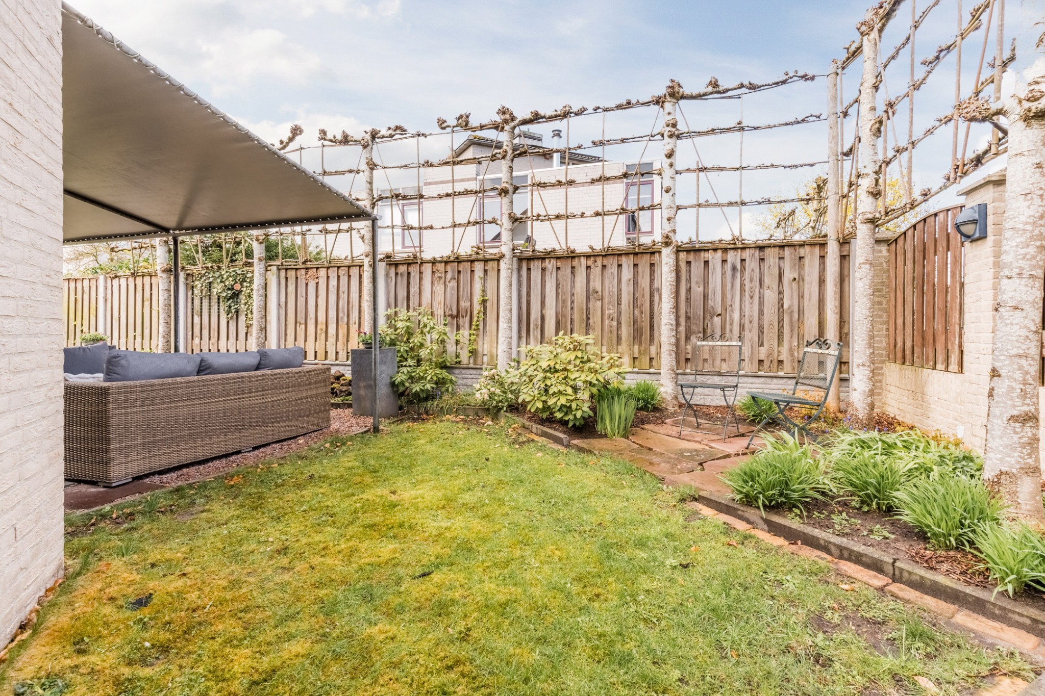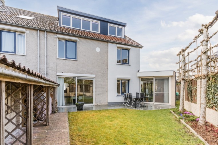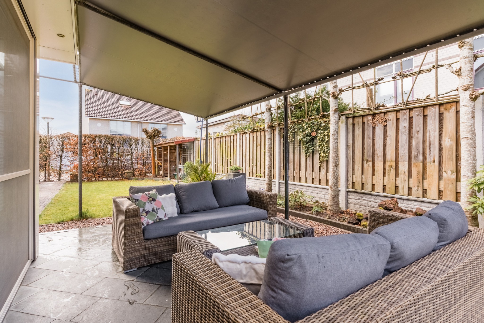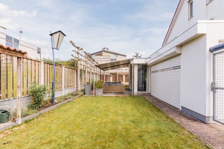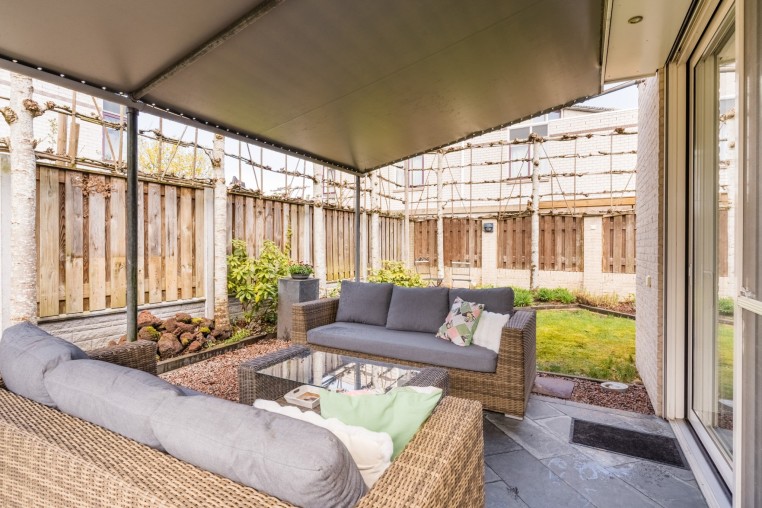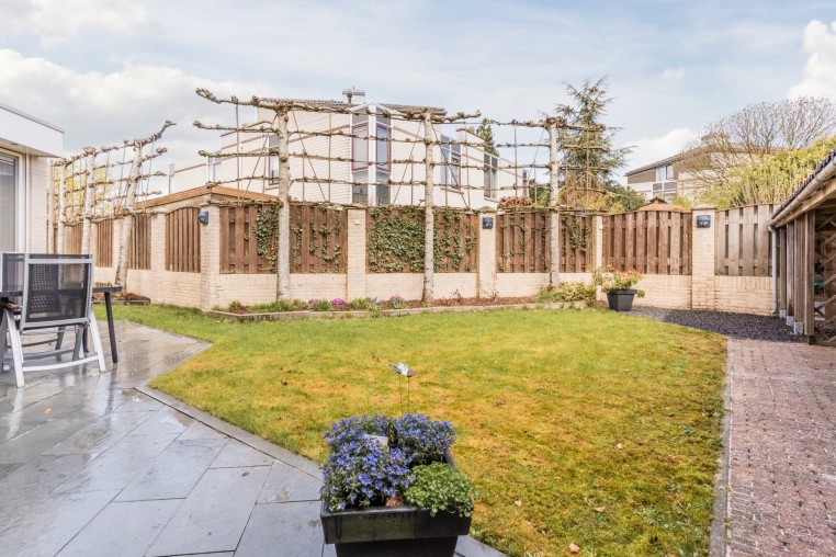 De woning beschikt over een fraai aangelegde tuin met diverse terrassen (één overdekt), die veel privacy biedt aan zowel de zij- als achterzijde. Hier kunt u heerlijk relaxen. Binnen en buiten in elkaar over door o.a. de diagonaal gelegde leistenen vloer die naadloos van binnen naar buiten doorloopt.