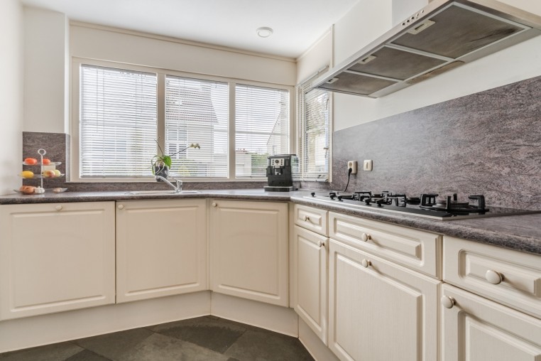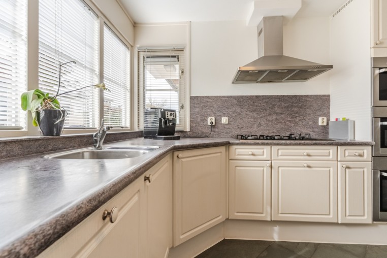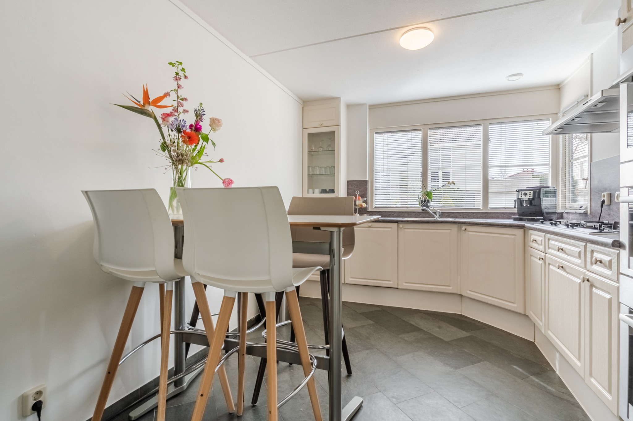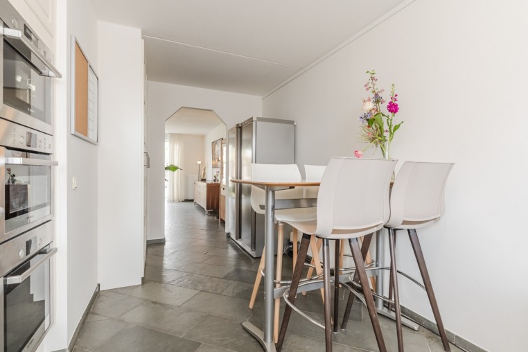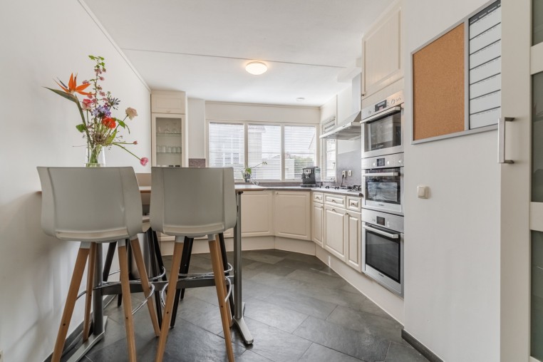 Semi-open keuken, ± 14 m², ruime kast en inrichting in hoekopstelling voorzien van diverse onder- en bovenkasten en inbouwapparatuur, t.w.: 5-pits gaskookplaat, afzuigschouw en 3 ovens te weten; stoomoven, combi-magnetron, oven en vaatwasser. Tevens bevindt zich in de keuken een groot formaat koel- en vrieskast.