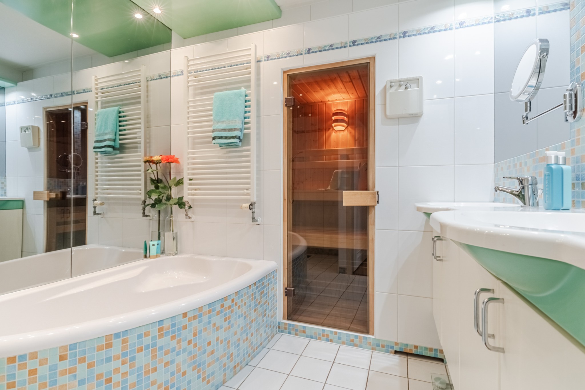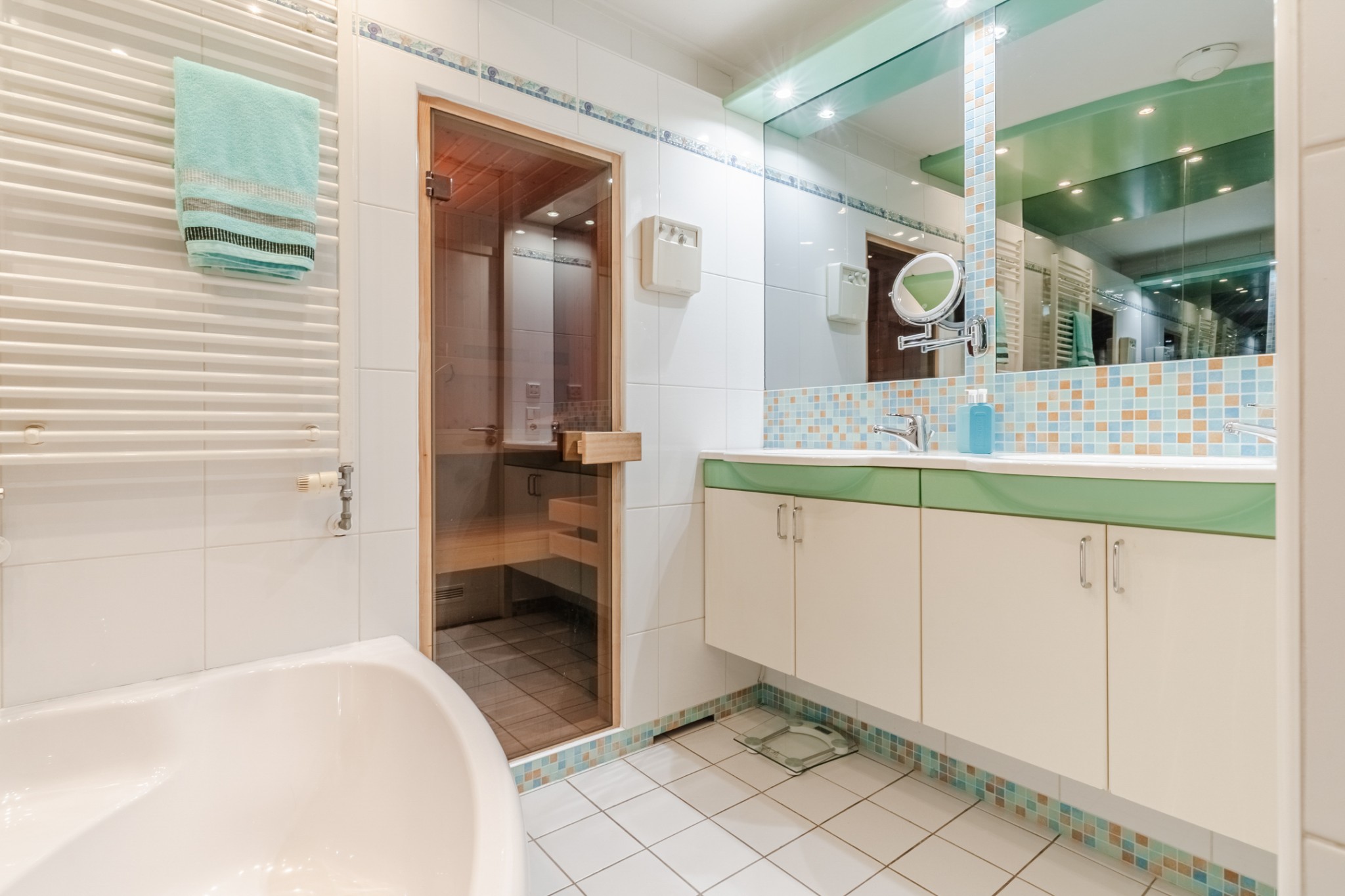 Badkamer 1, ruim en geheel betegeld inclusief spiegelwand, voorzien van een hoekbad, inloopdouche, badkamermeubel met 2 wastafels en een sauna.