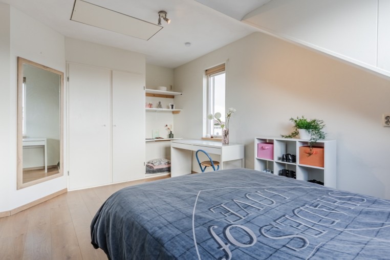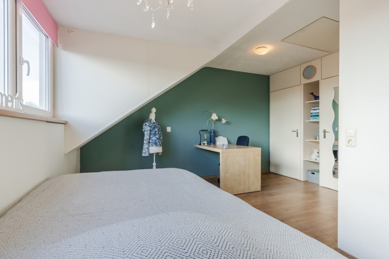 Slaapkamer 6, ± 13 m², voorzien van dakkapel, zijraam, inbouwkasten, berging onder de kapschuinte en luik met vlizotrap naar bergzolder 2.