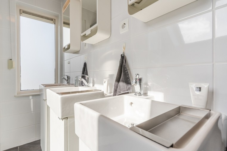 Verder drie wastafels inclusief badkamermeubels en elk een spiegelkast.