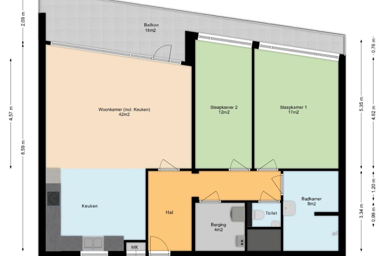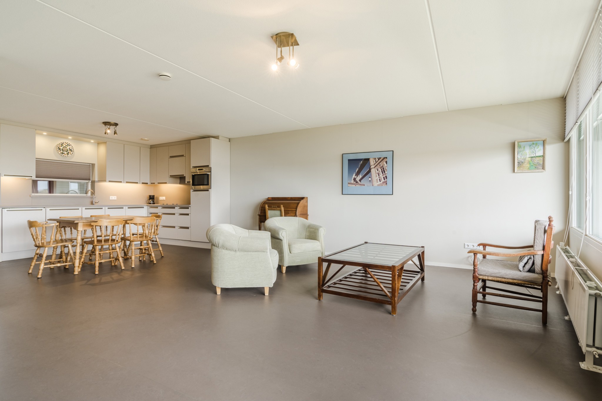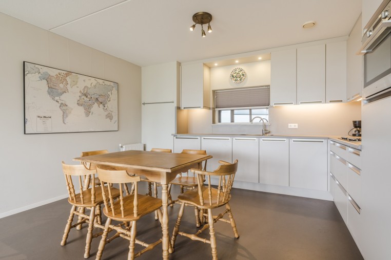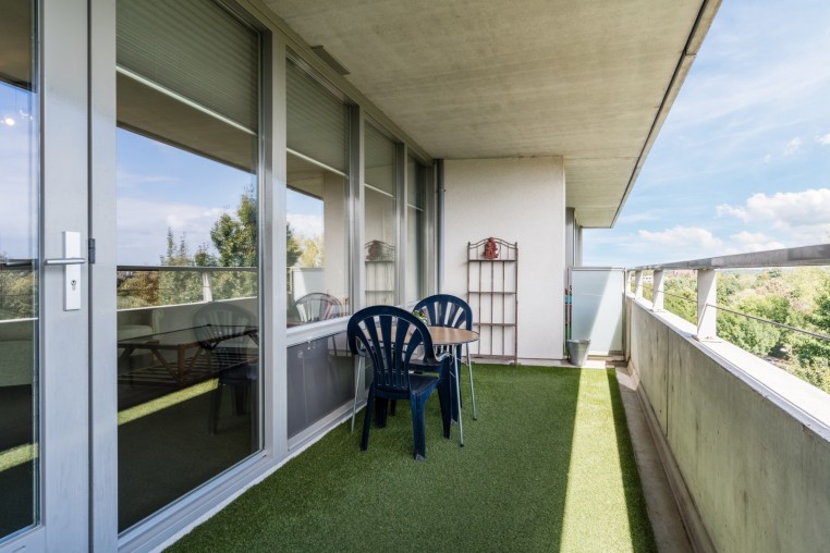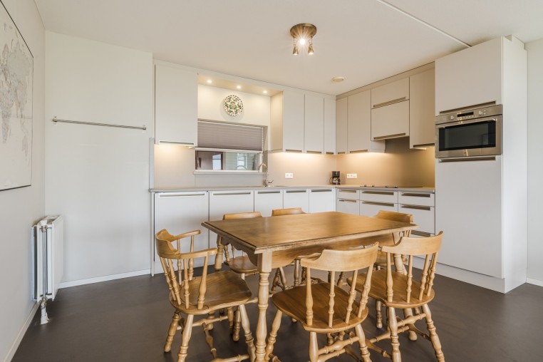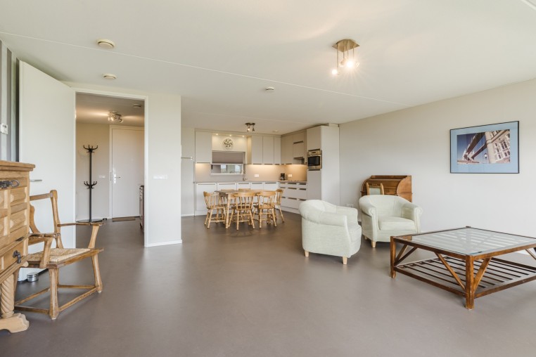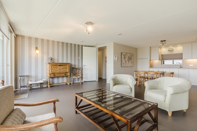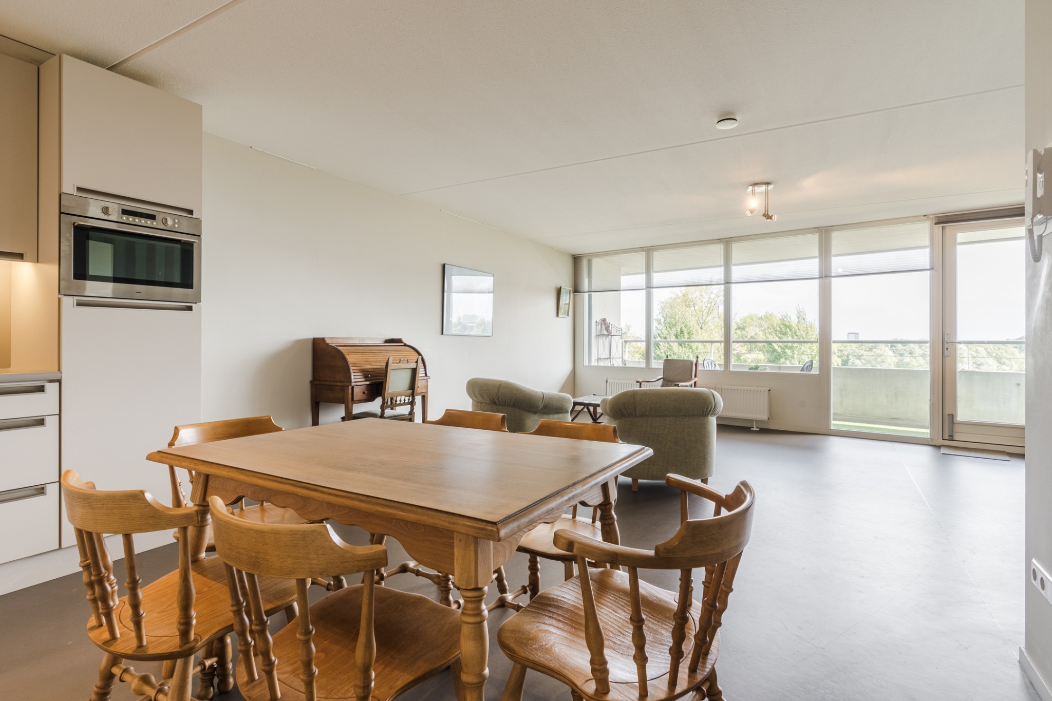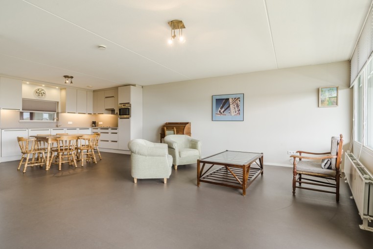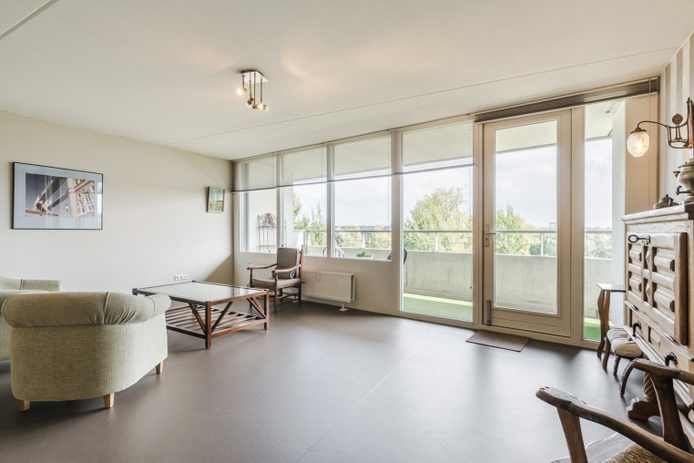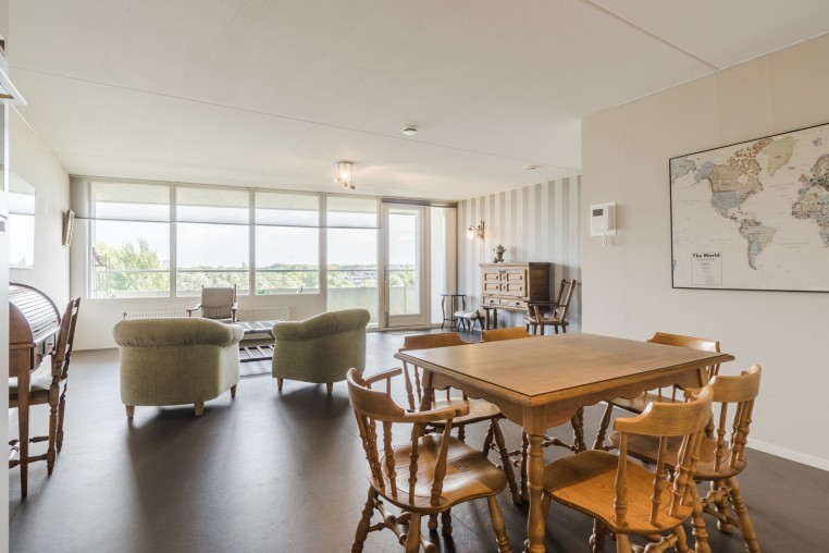 Ruime, sfeervolle woonkamer, ± 42 m² inclusief keuken, met prettig veel lichtinval door grote raampartij, voorzien van Novilon vloer en deur naar royaal balkon, ± 18 m². Het balkon is op het Oosten gelegen en biedt een prachtig uitzicht over het Dommeldal.