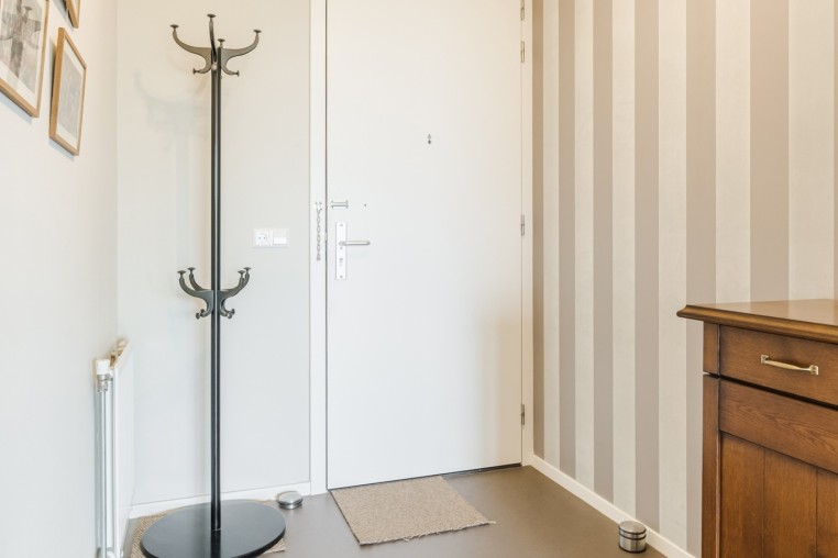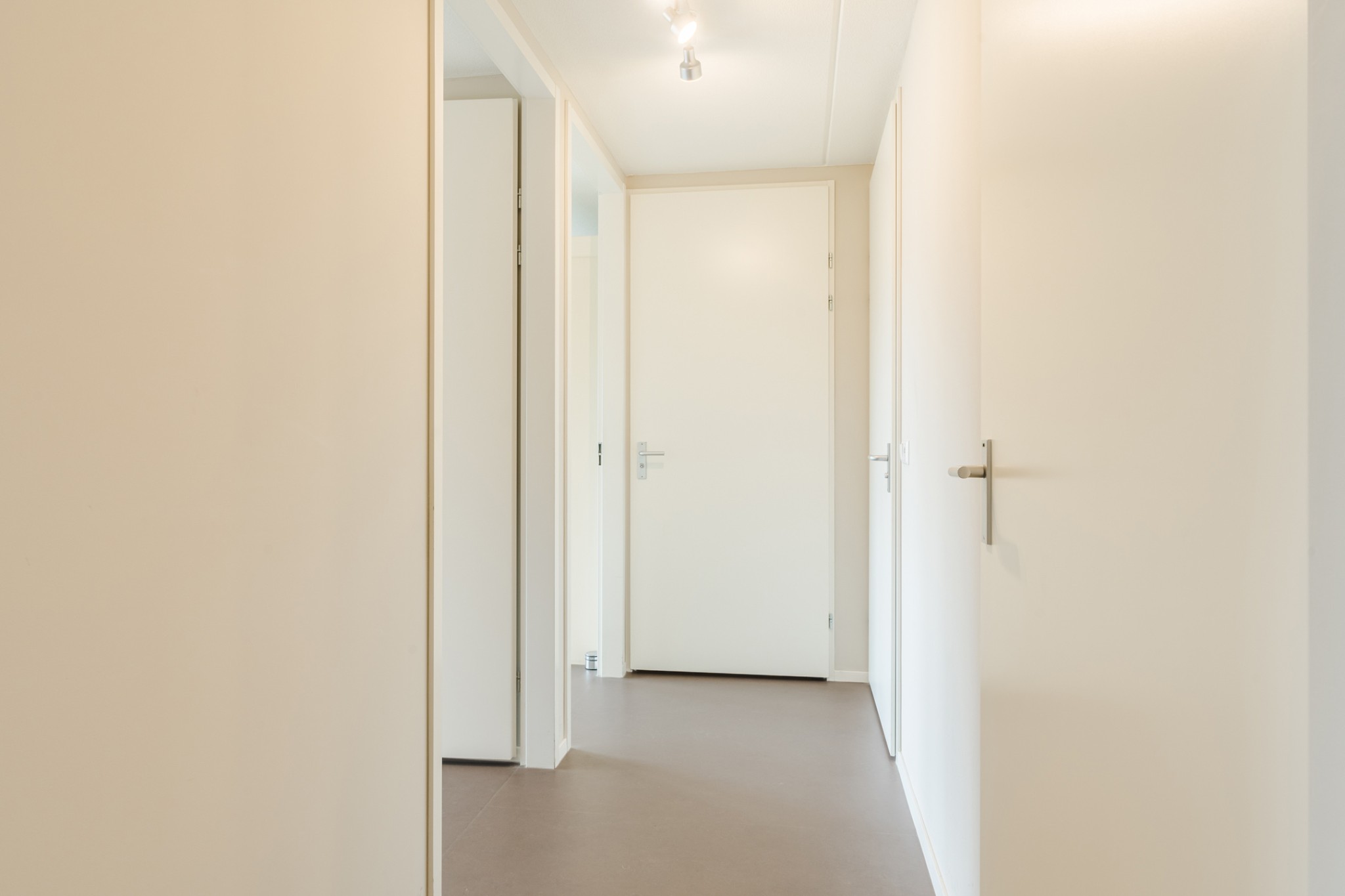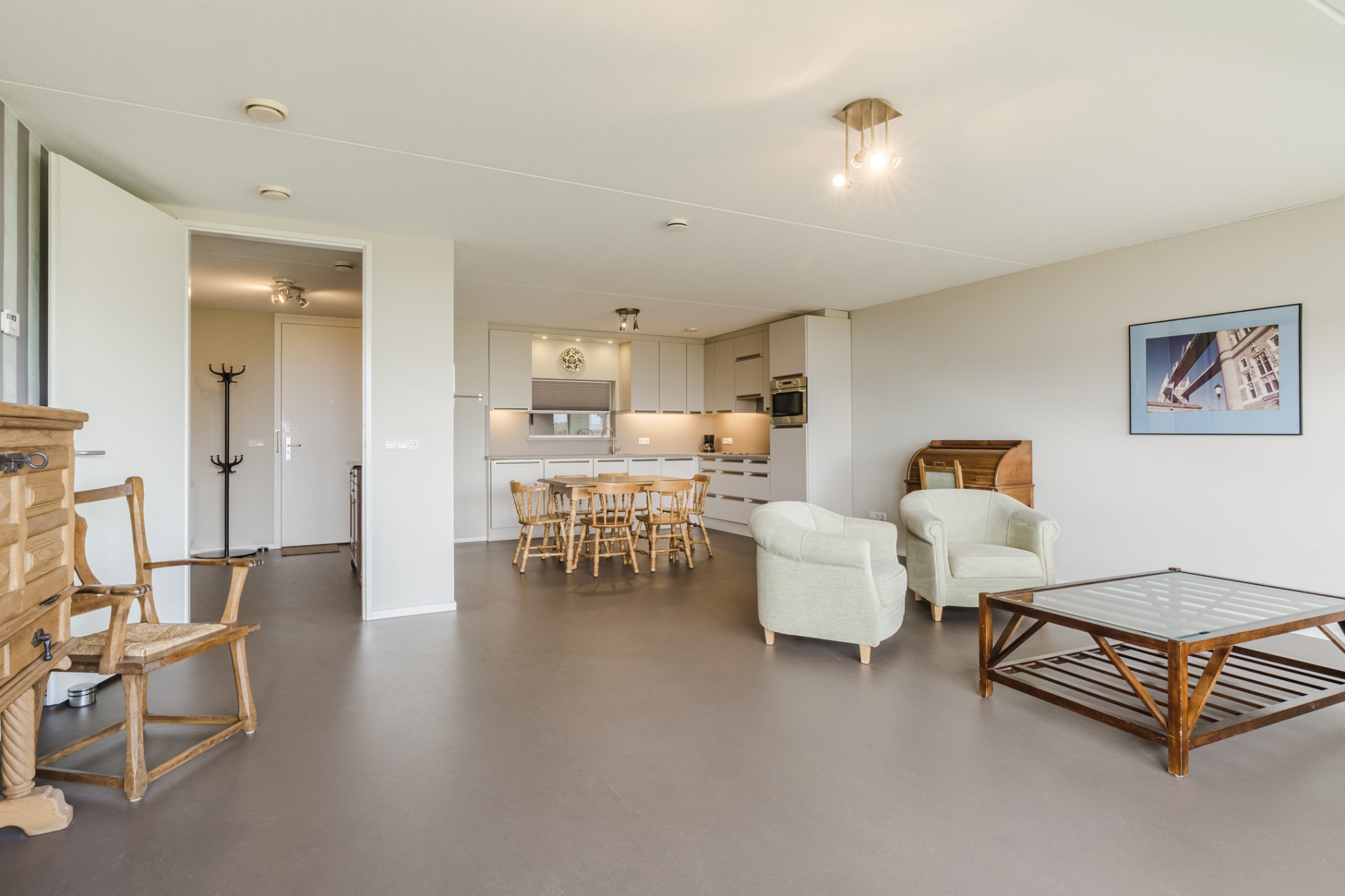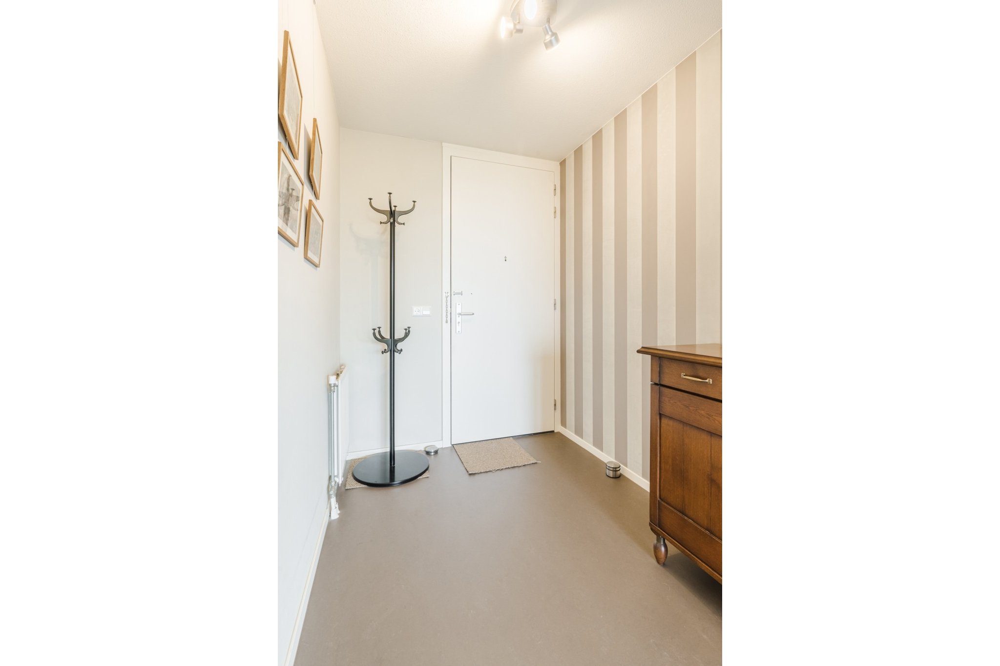 Ruime hal met Novilon vloer en garderobehoek.