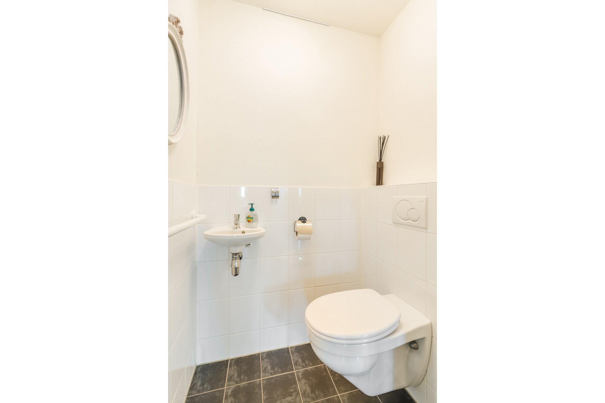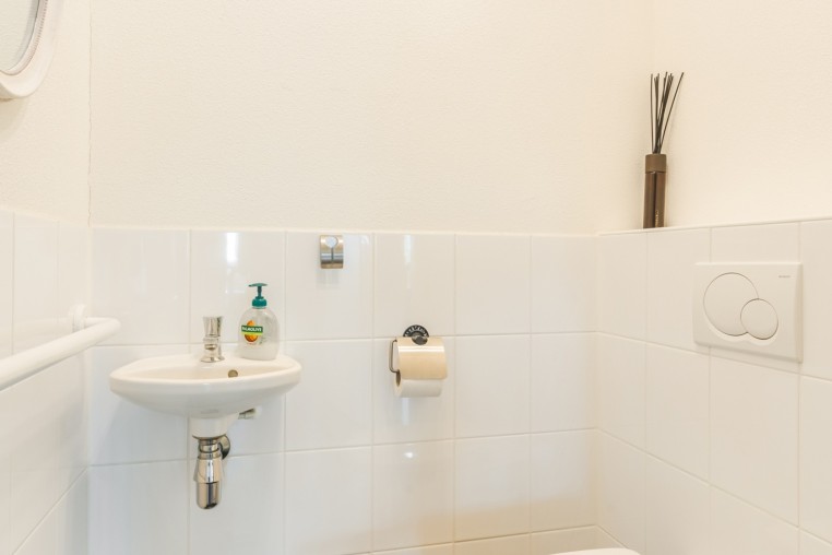 Moderne, deels betegelde toiletruimte met wandcloset en fonteintje.
