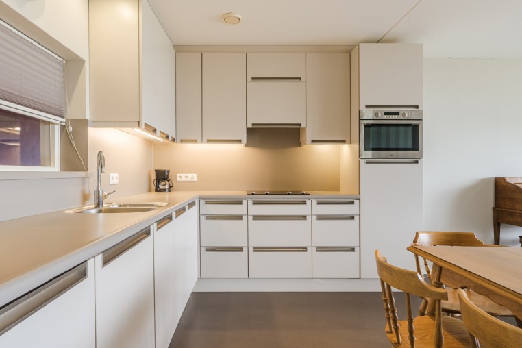 Moderne open keuken in hoekopstelling voorzien van diverse onder- en bovenkasten en inbouwapparatuur, t.w.: inductie kookplaat, afzuigkap, combimagnetron, koelkast en vriezer.