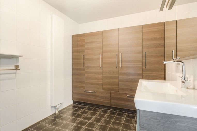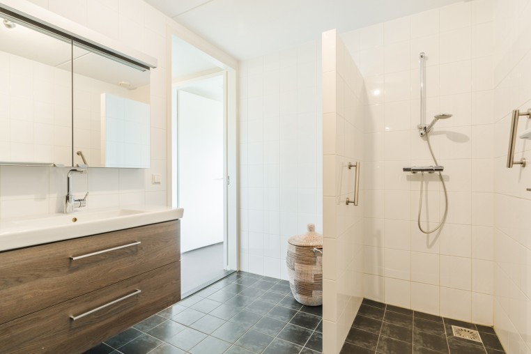 Luxe en royale, geheel betegelde badkamer, ± 8 m², voorzien van ruime inloopdouche, badmeubel met vaste wastafel, spiegelkast, fraaie kastenwand en designradiator.