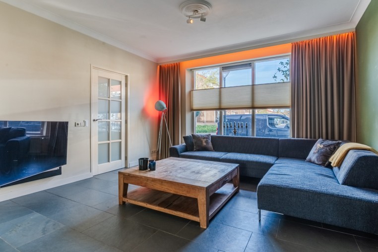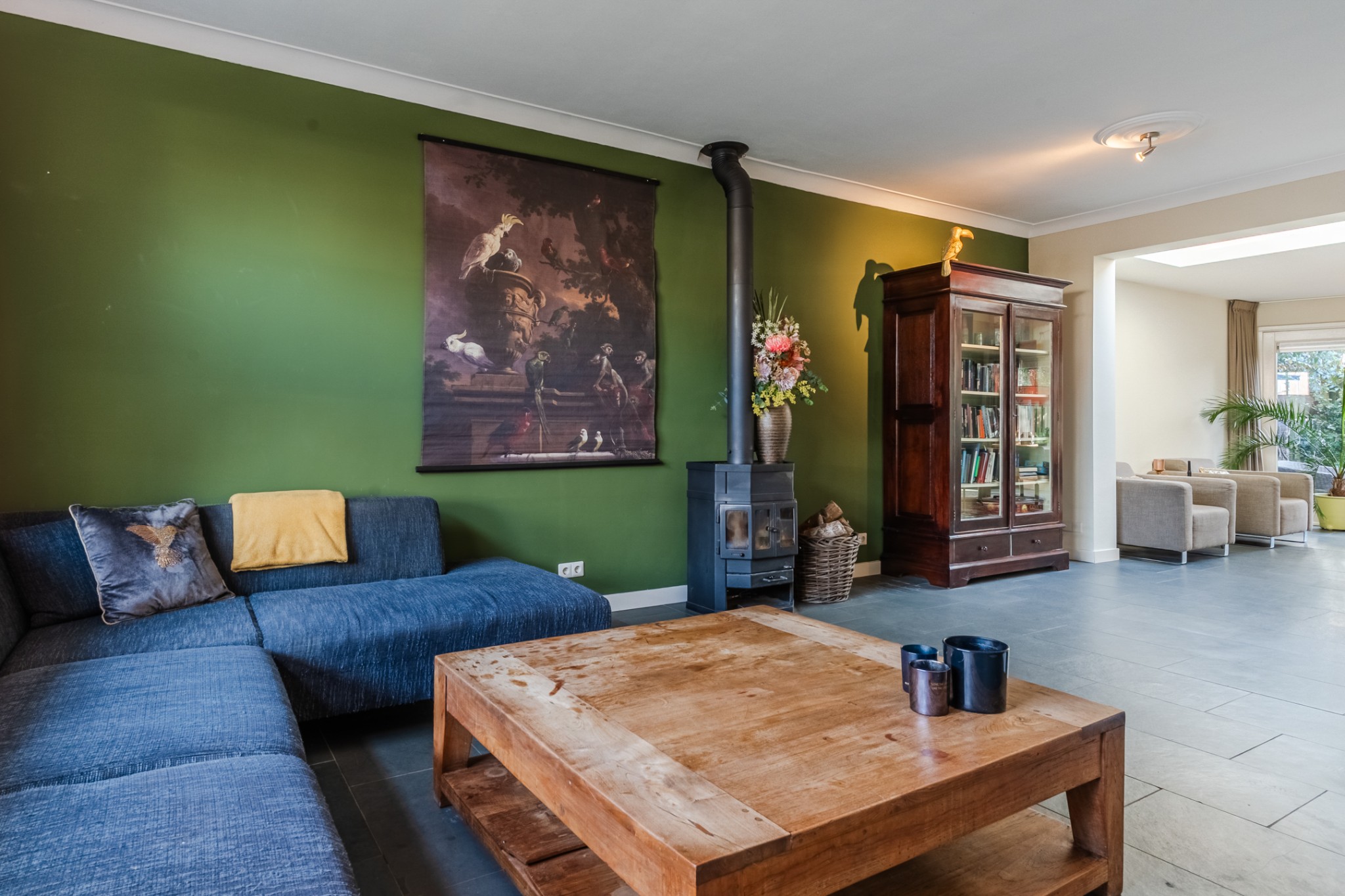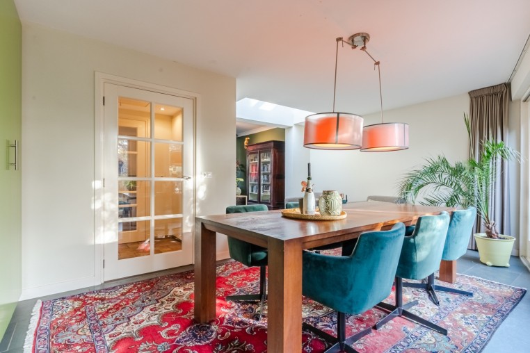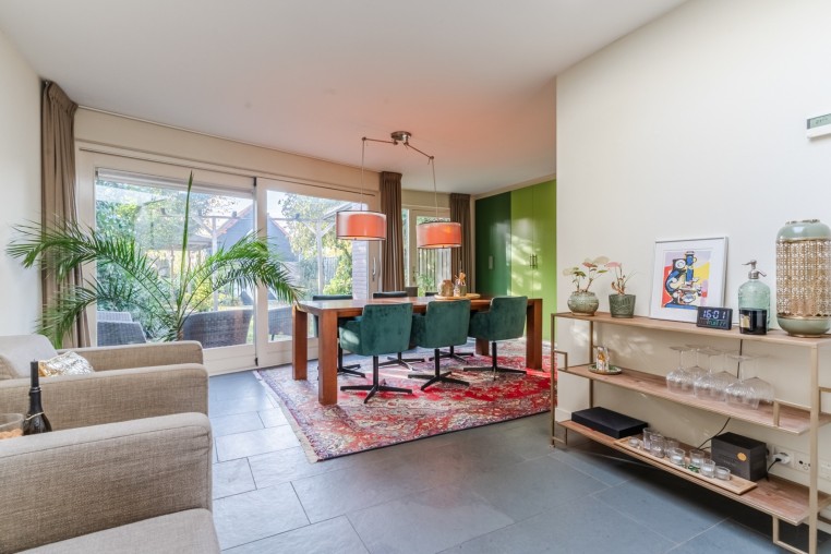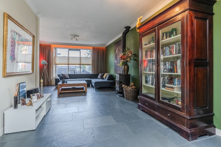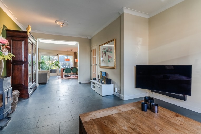 Ruime en sfeervolle living, ± 53 m², voorzien van tegelvloer met vloerverwarming, houtkachel en stucwerk wanden en plafond. De living is ingedeeld in een ruime zithoek en zeer royale eetkamer met praktische op maat gemaakte inbouwkast. Veel lichtinval door grote raampartijen en lichtstraat.