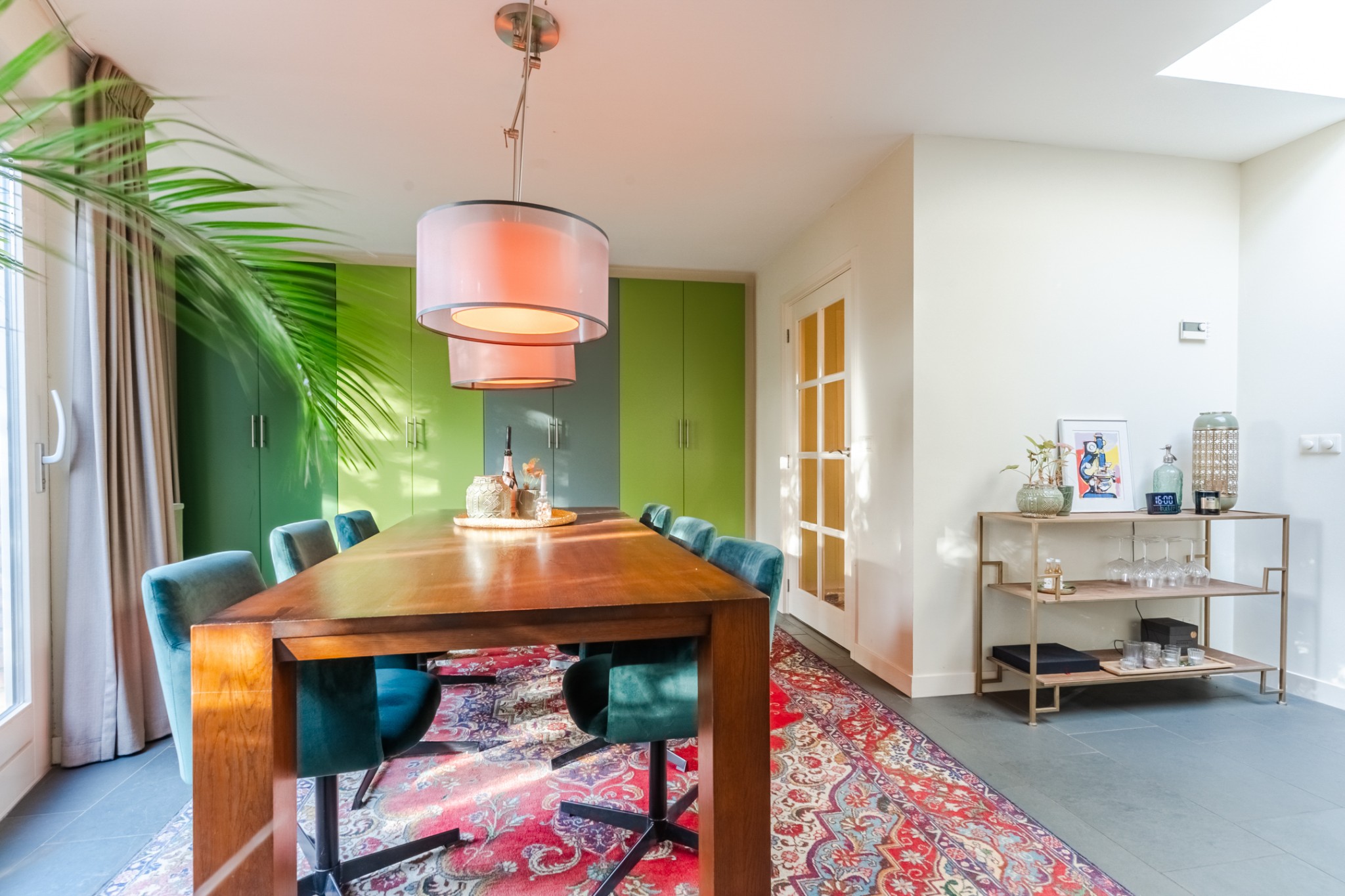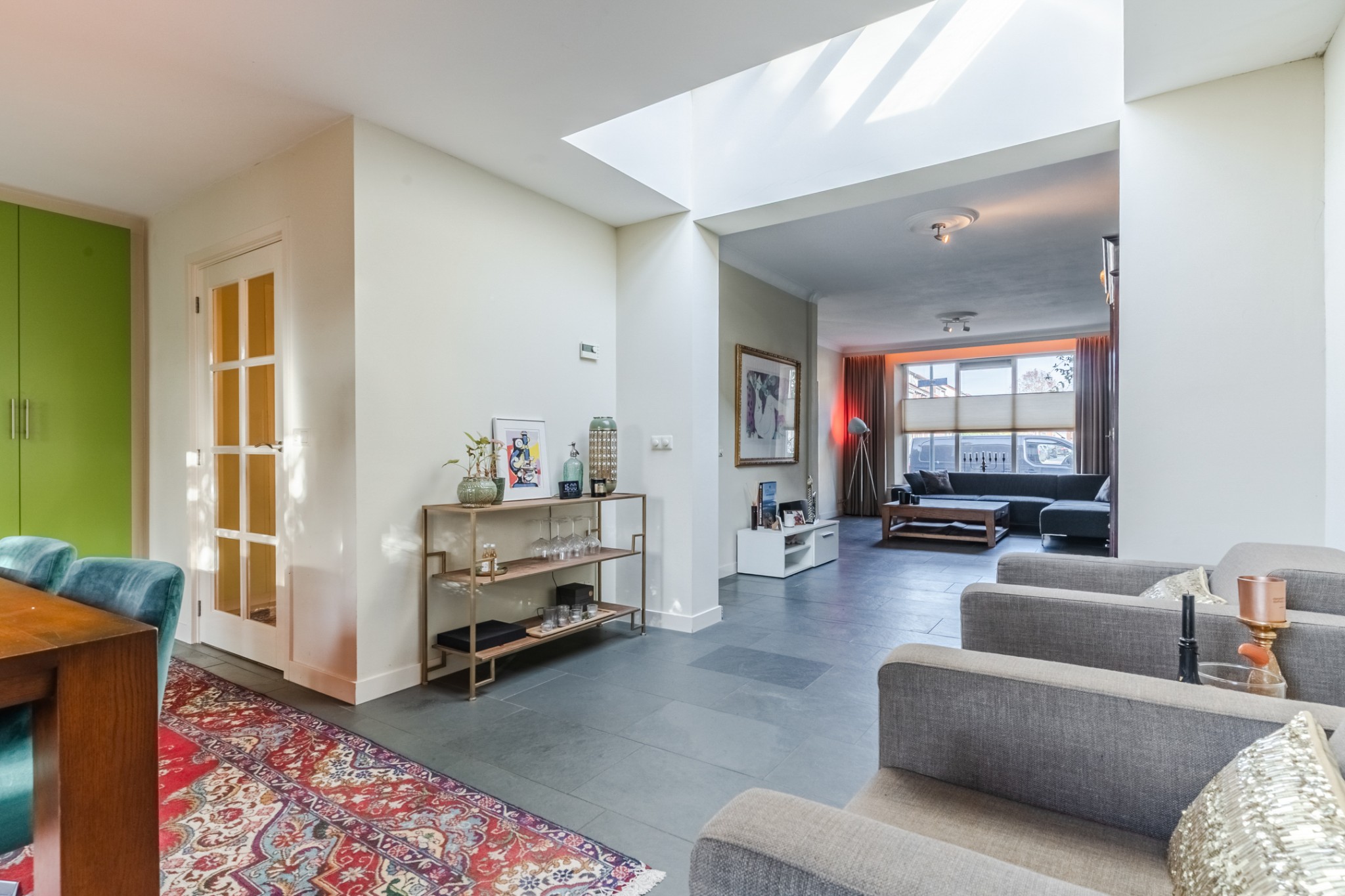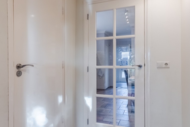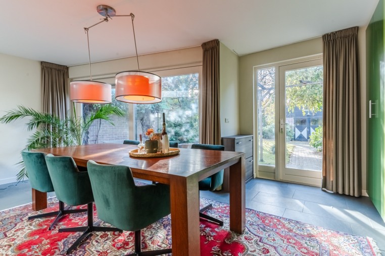 Ruime en sfeervolle living, ± 53 m², voorzien van tegelvloer met vloerverwarming, houtkachel en stucwerk wanden en plafond. De living is ingedeeld in een ruime zithoek en zeer royale eetkamer met praktische op maat gemaakte inbouwkast. Veel lichtinval door grote raampartijen en lichtstraat.