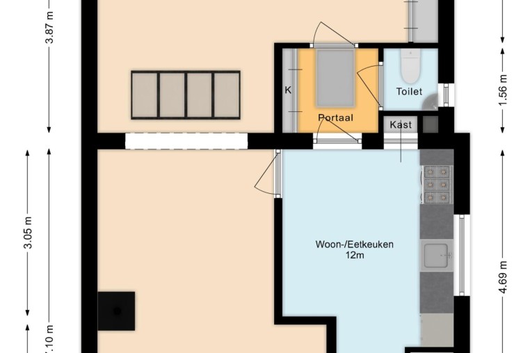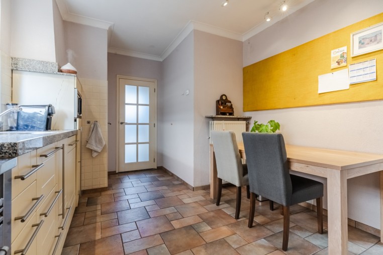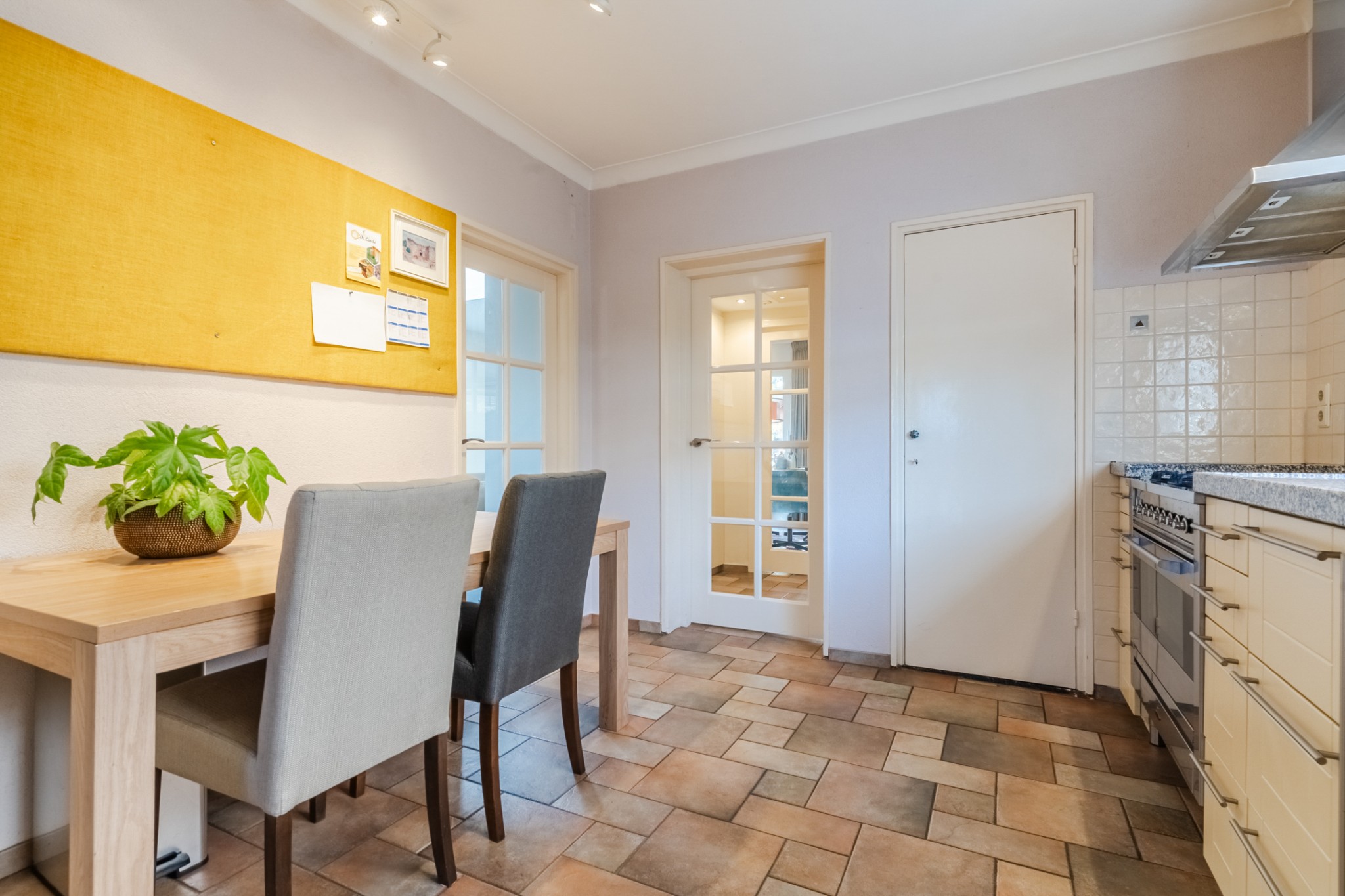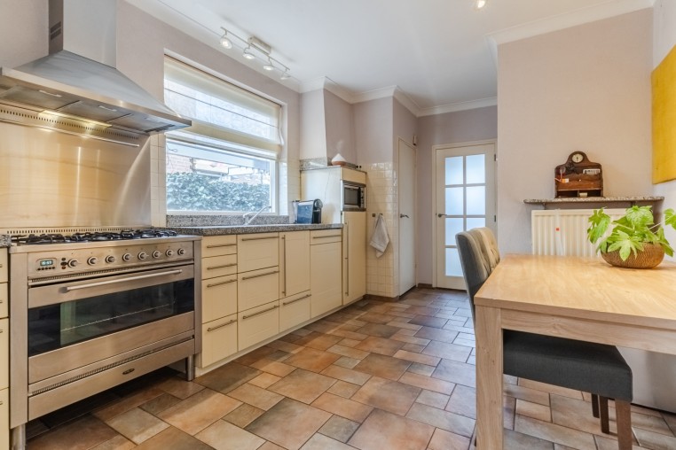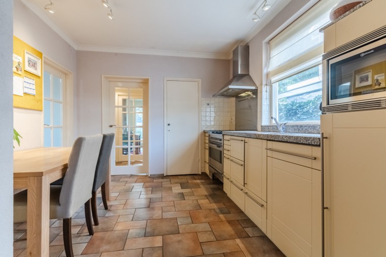 Dichte woon-/eetkeuken voorzien van tegelvloer, diverse onderkasten, royale kelderkast en inbouwapparatuur, t.w.: 6-pits gasfornuis met oven (Boretti), afzuigschouw, magnetron, koelkast en vaatwasser.