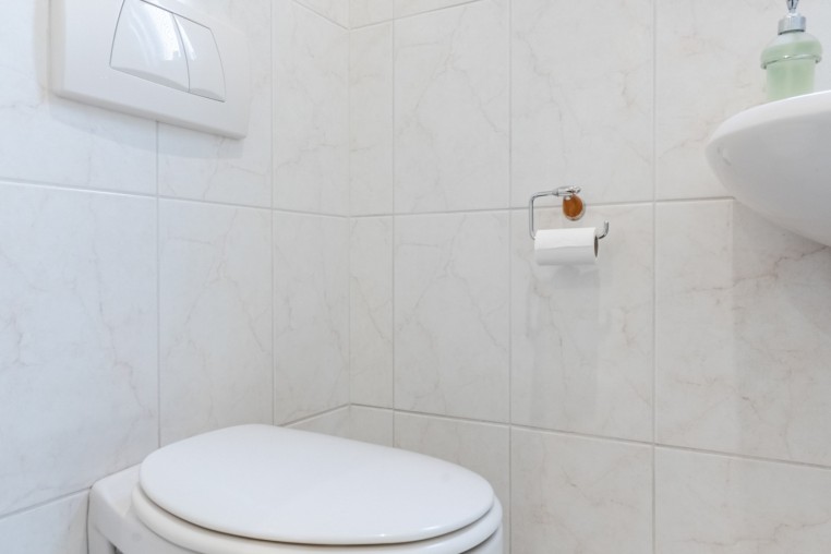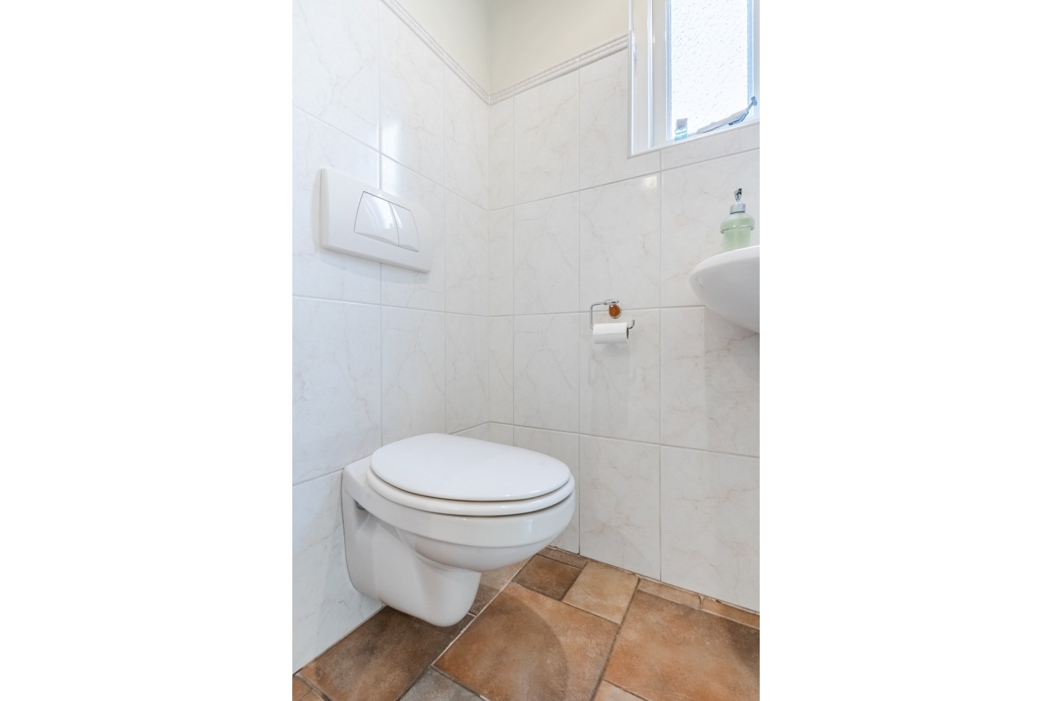 Nette, deels betegelde toiletruimte met hangend toilet en fonteintje.