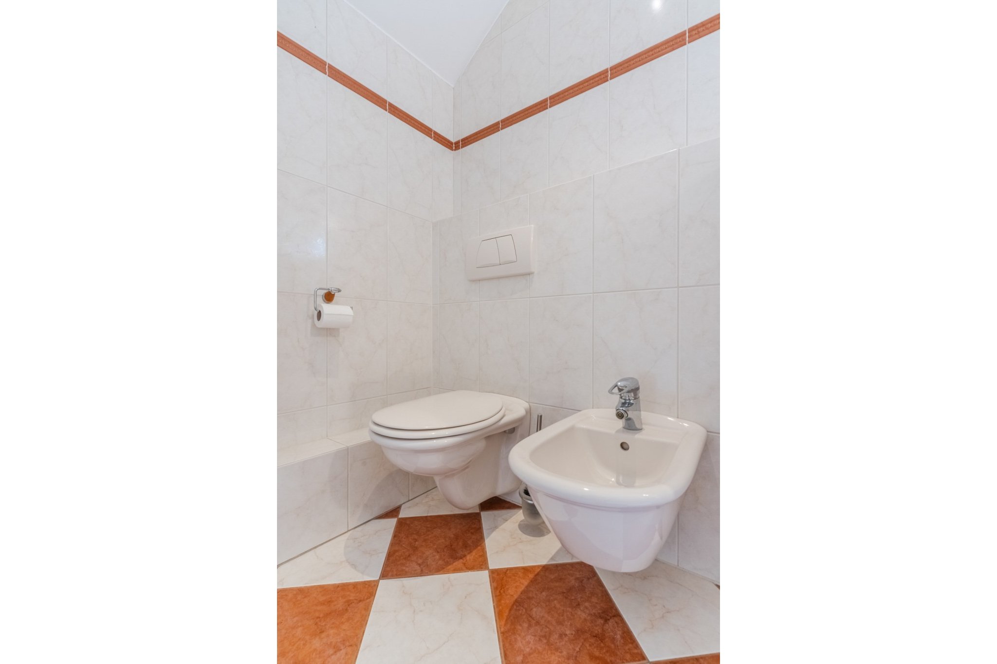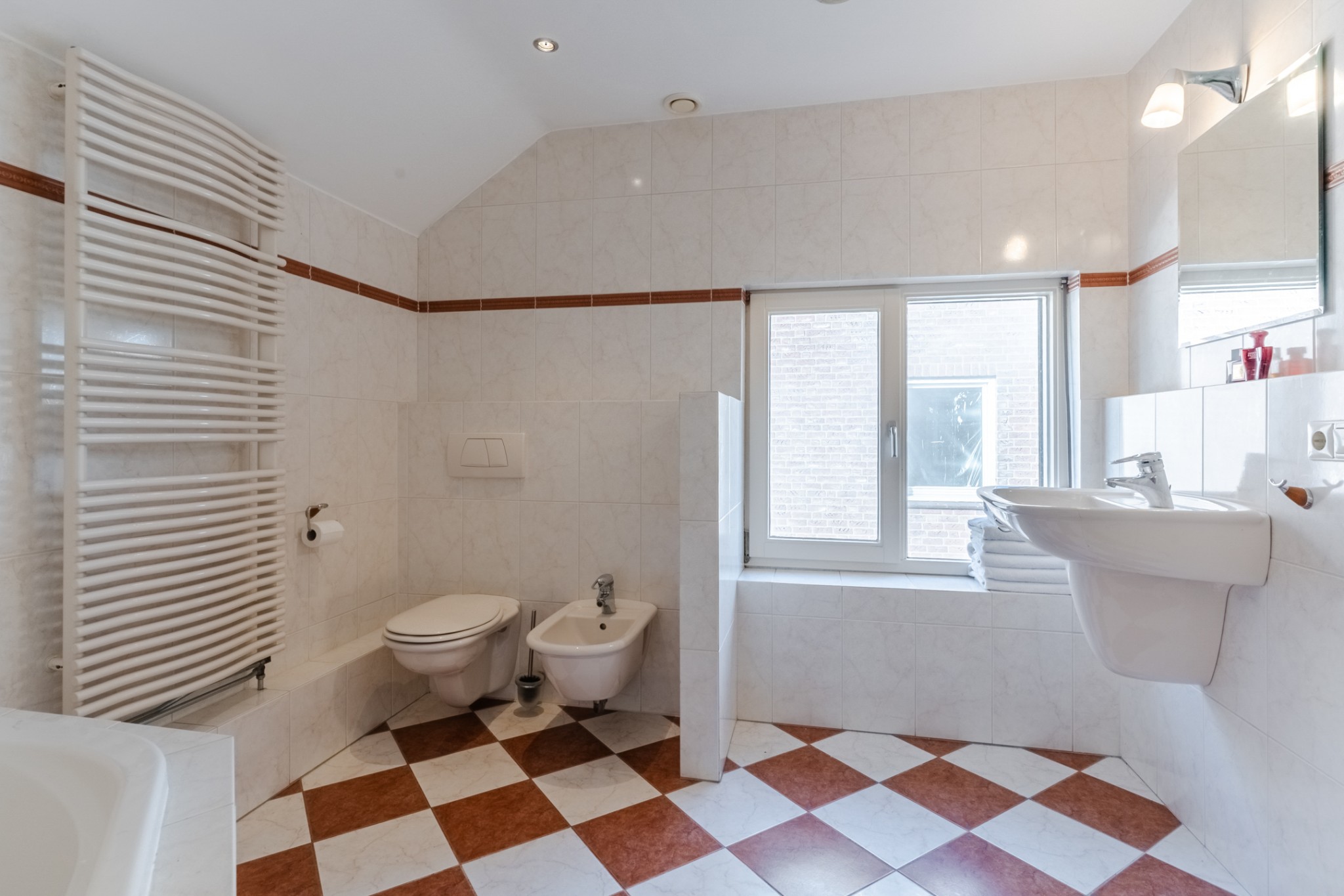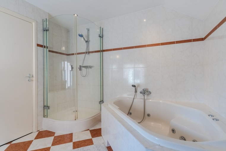 Zeer royale, tot plafond betegelde badkamer voorzien van ruim hoekbad, separate douche, hangend toilet, bidet en vaste wastafel en handmatig bedienbaar rolluik.